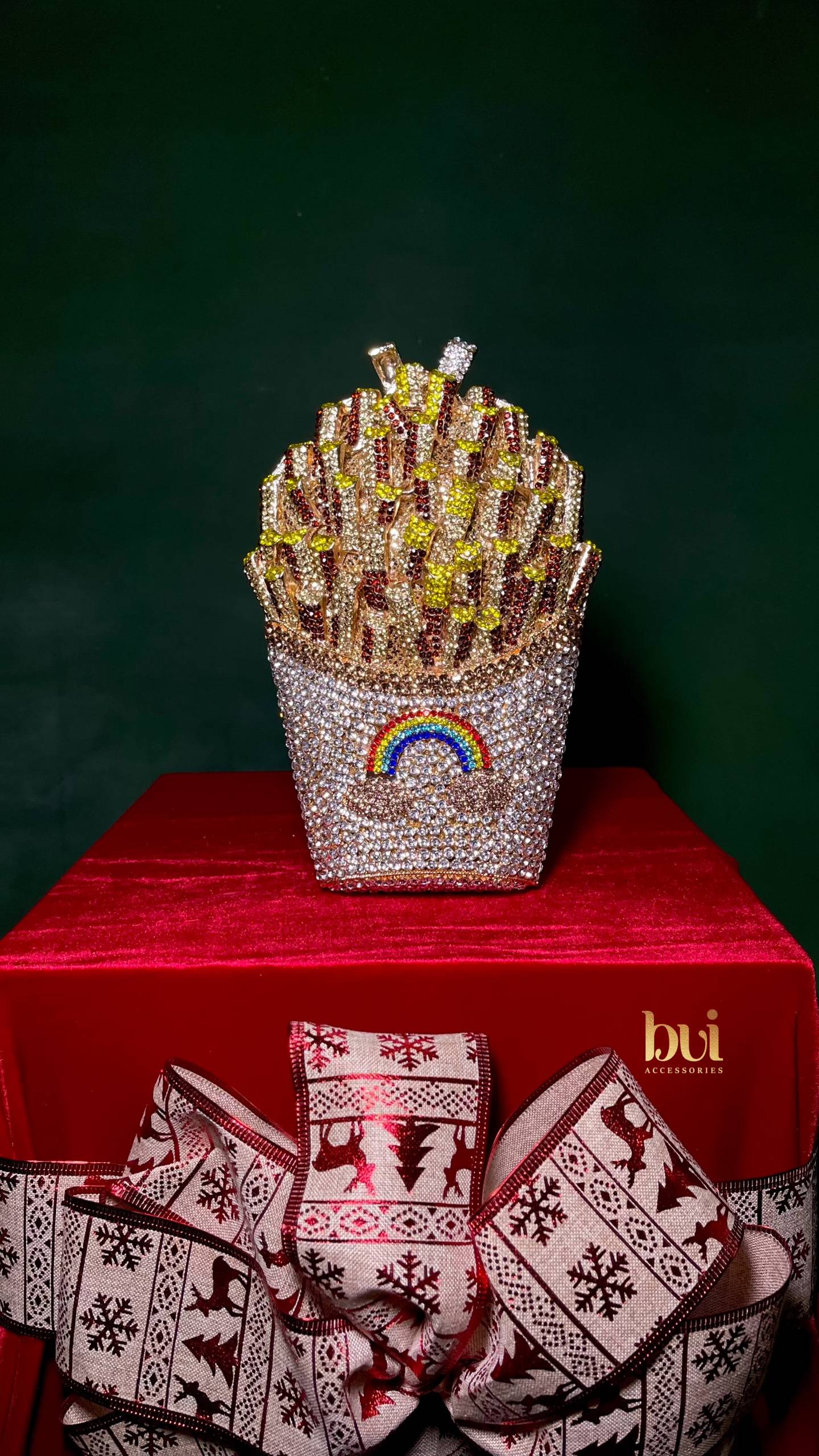 Make a bold, playful statement with our Fries Crystal Clutch, a novelty handbag that turns heads and sparks conversations. Inspired by your favorite comfort snack, this luxury crystal bag is handcrafted with shimmering rhinestones in vibrant red, orange, and gold tones—finished with a cheeky rainbow detail for a burst of joy.
