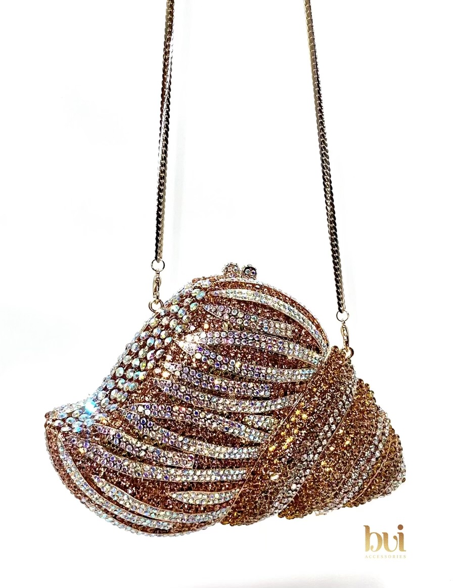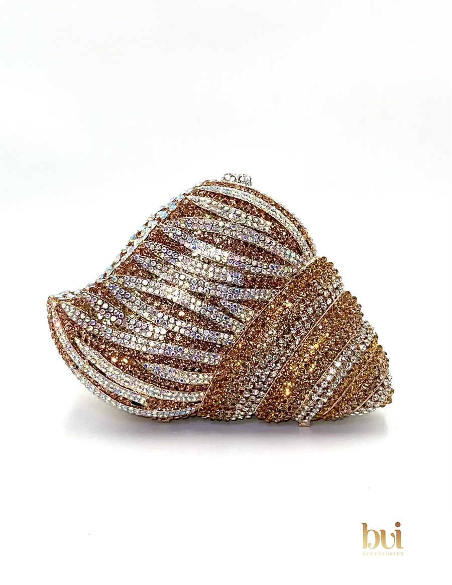 Dive into elegance with the Zara Shell Jewel Clutch, a mesmerizing handmade rhinestone evening bag inspired by the beauty of the sea. Crafted in a stunning seashell silhouette, this clutch shimmers with a breathtaking blend of gold and iridescent rhinestones, capturing the magic of ocean waves meeting golden sunsets.