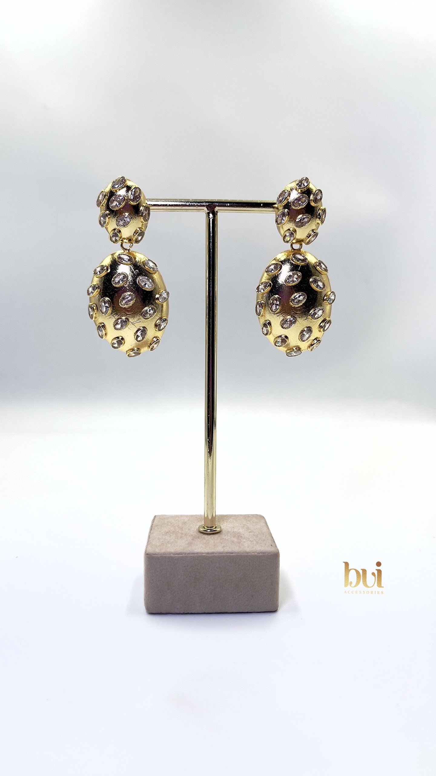 The Gold Crystal Dome Drop Earrings are designed for the woman who appreciates bold elegance with refined detail. Featuring a structured double-dome silhouette, each piece is adorned with delicately embedded crystals that catch the light from every angle.