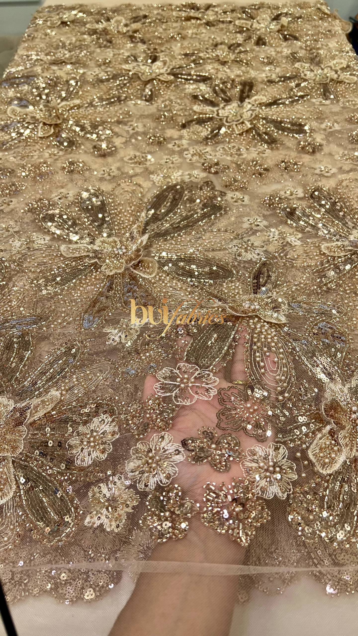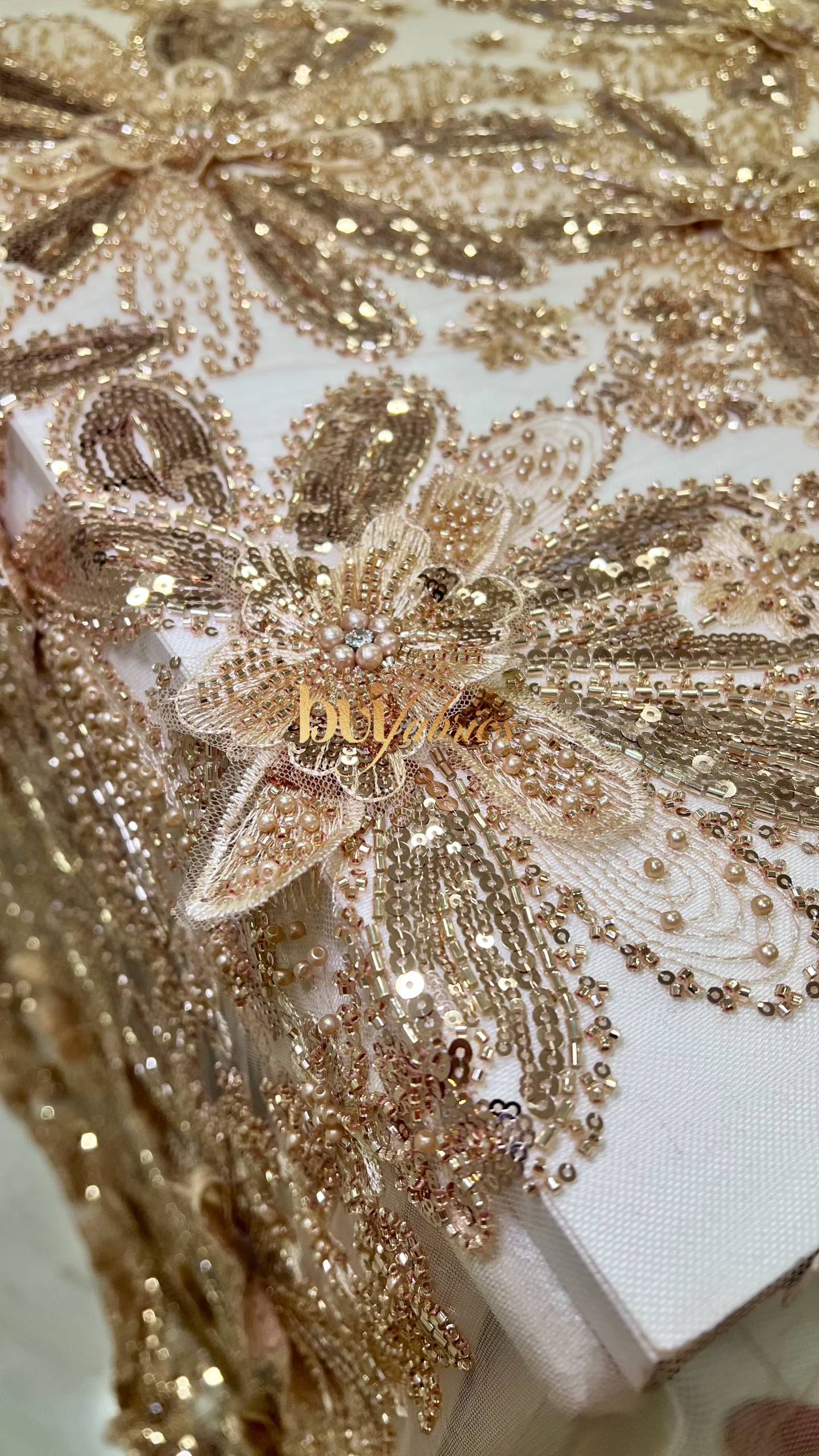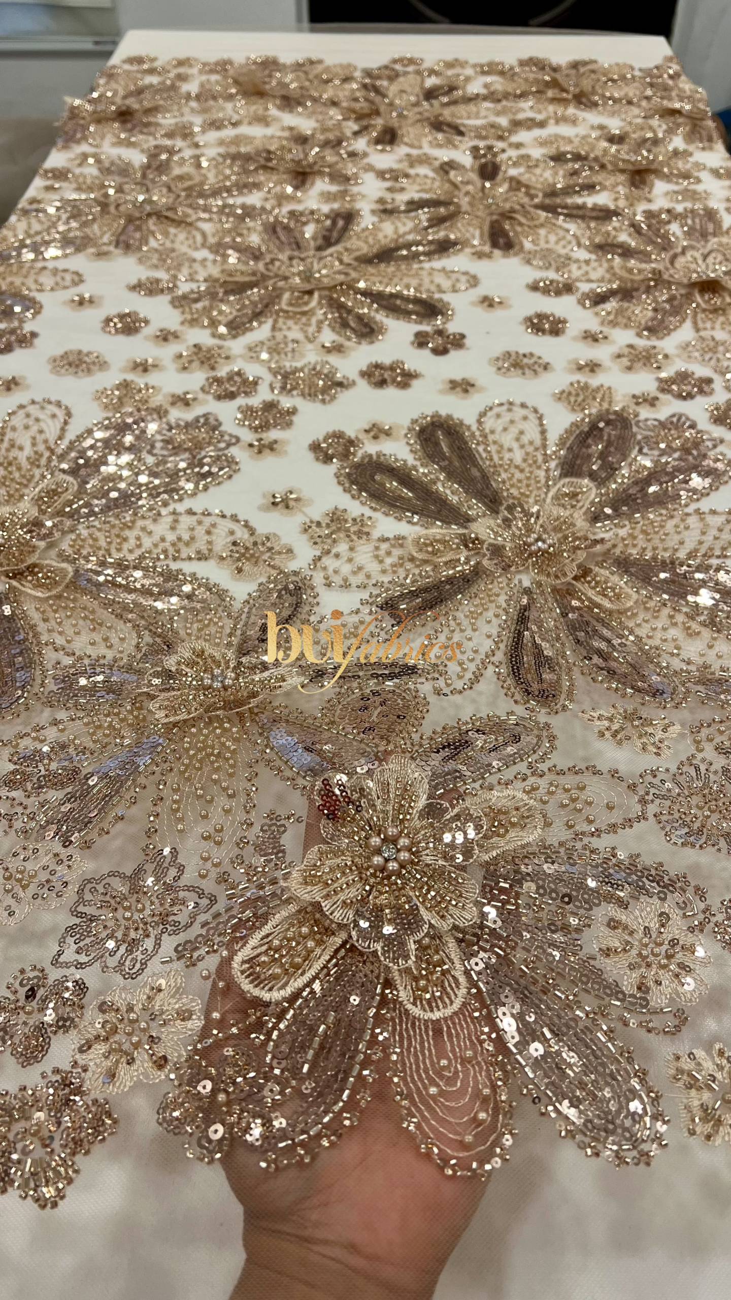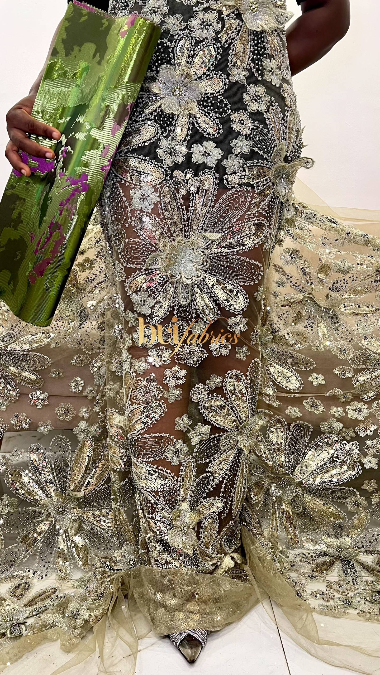 Every detail is intentional. The raised floral elements create depth and movement, while the dense beading catches the light beautifully, making this fabric perfect for luxury asoebi, engagement looks, mother-of-the-bride ensembles, and even bridal statement pieces. It is lush, dramatic, and truly regal—made for moments that demand presence.