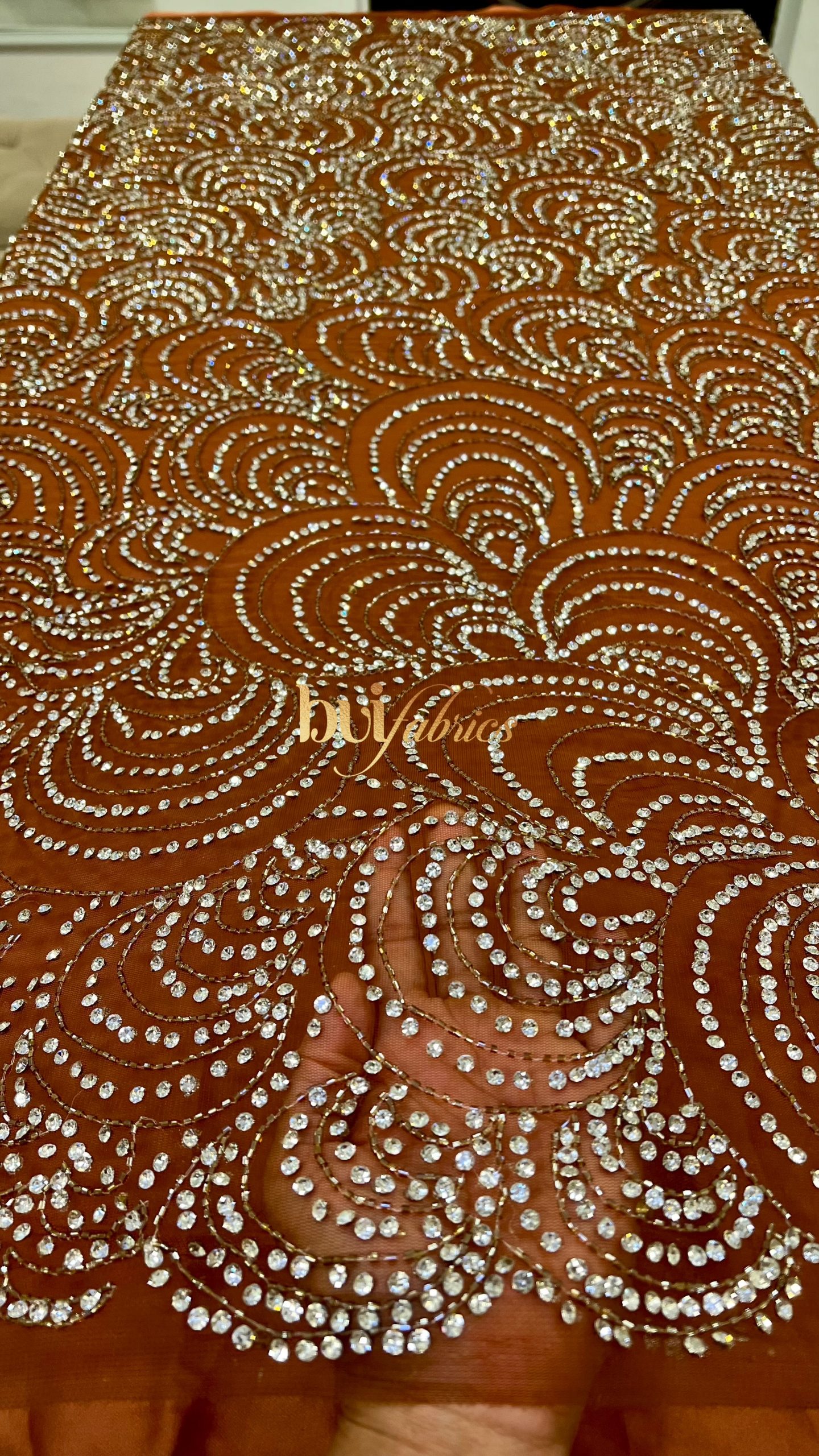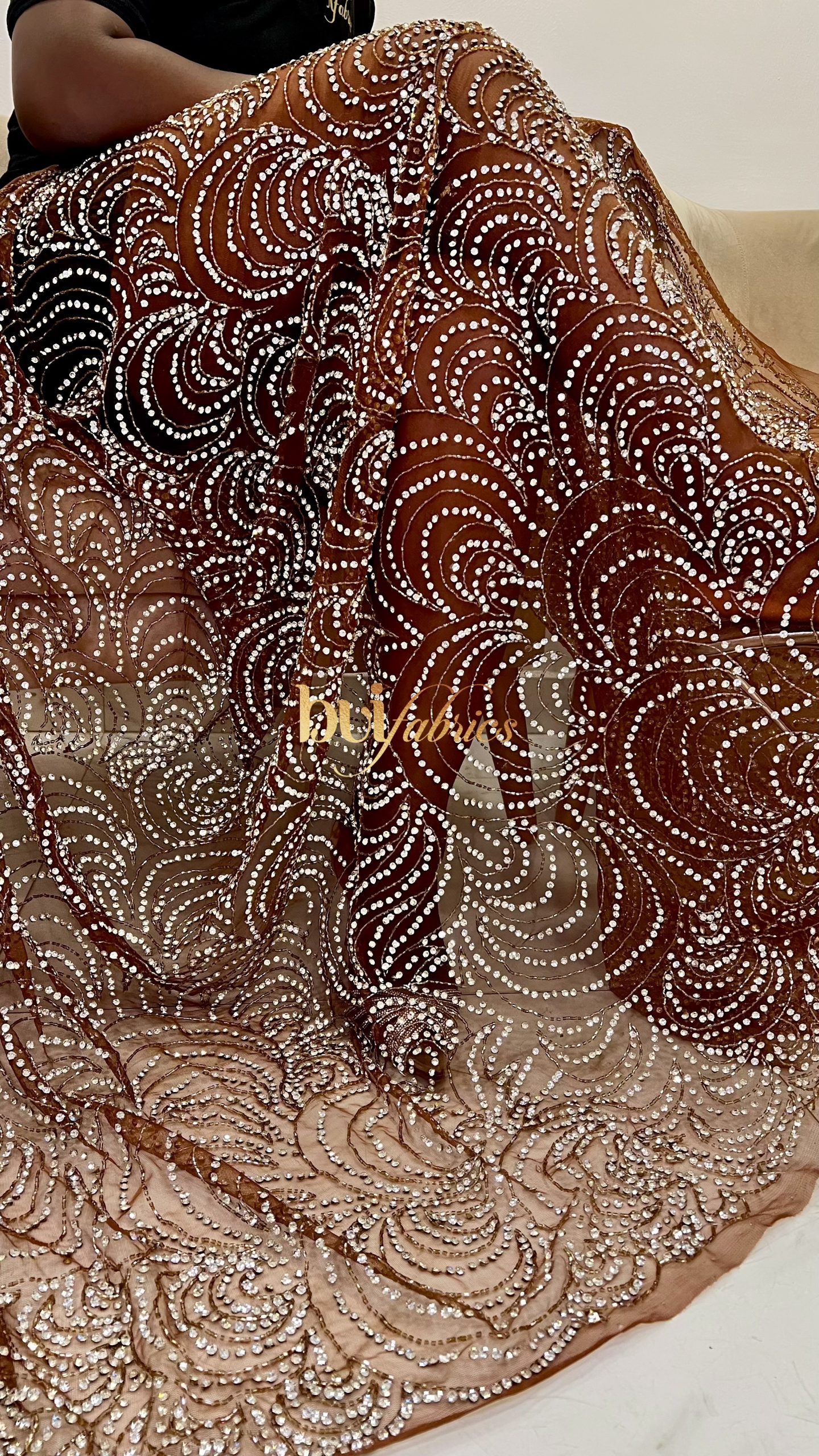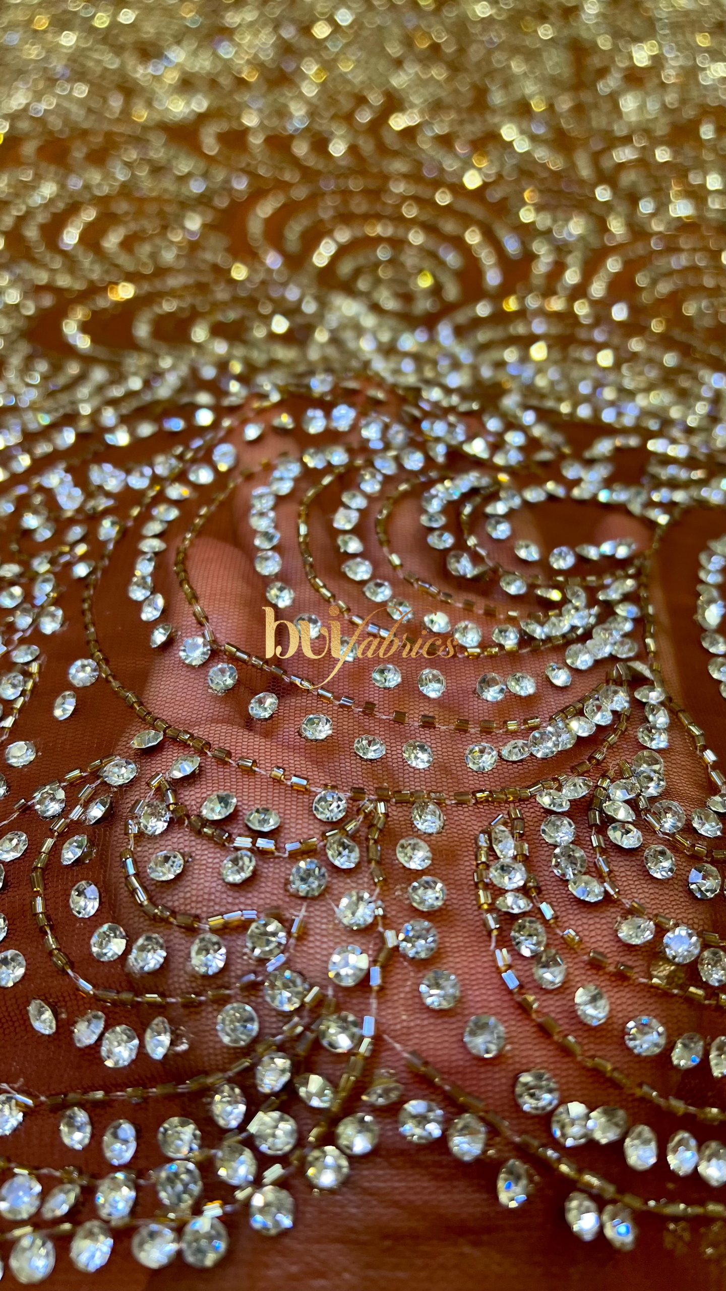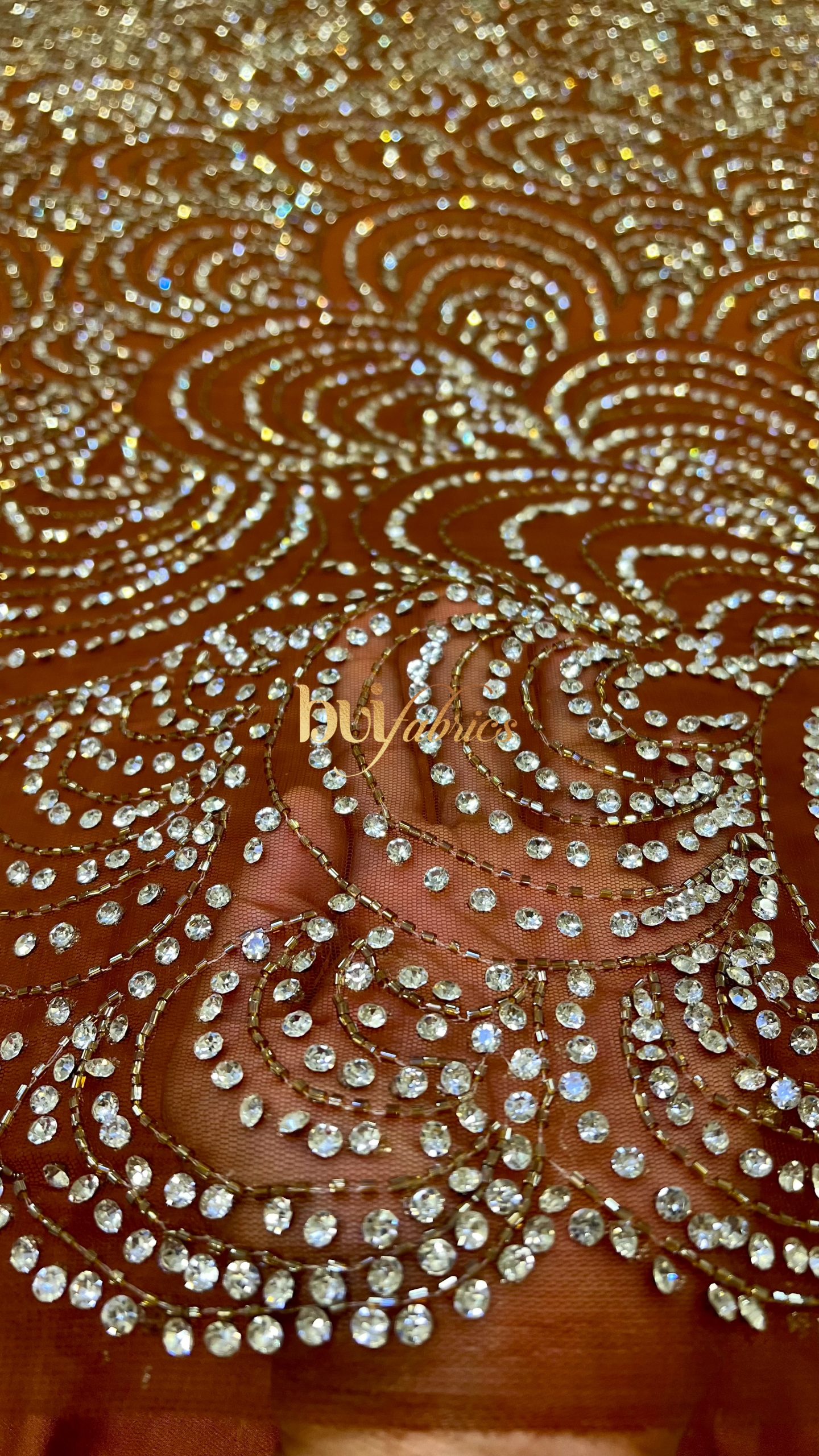 The Amara Crystal Tulle is a radiant masterpiece of craftsmanship and sophistication. Designed on a rich brown tulle base, this fabric features hand-applied crystals arranged in an intricate wave pattern that sparkles with every movement. Each stone is meticulously set to create a rhythmic, light-catching flow — a visual symphony of elegance and glamour.