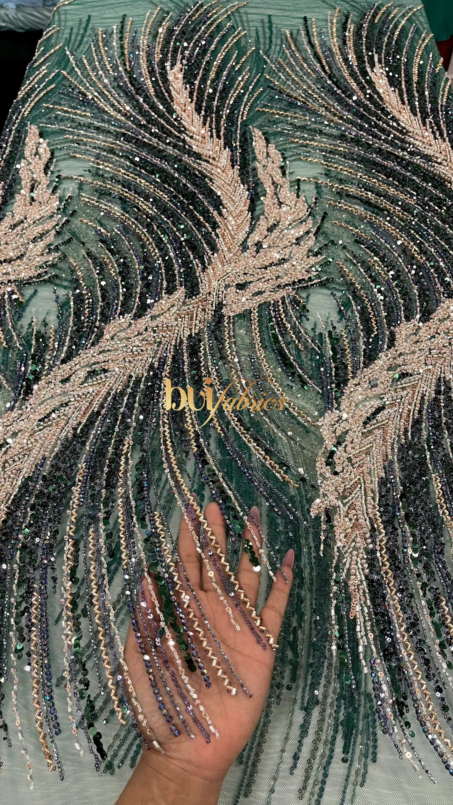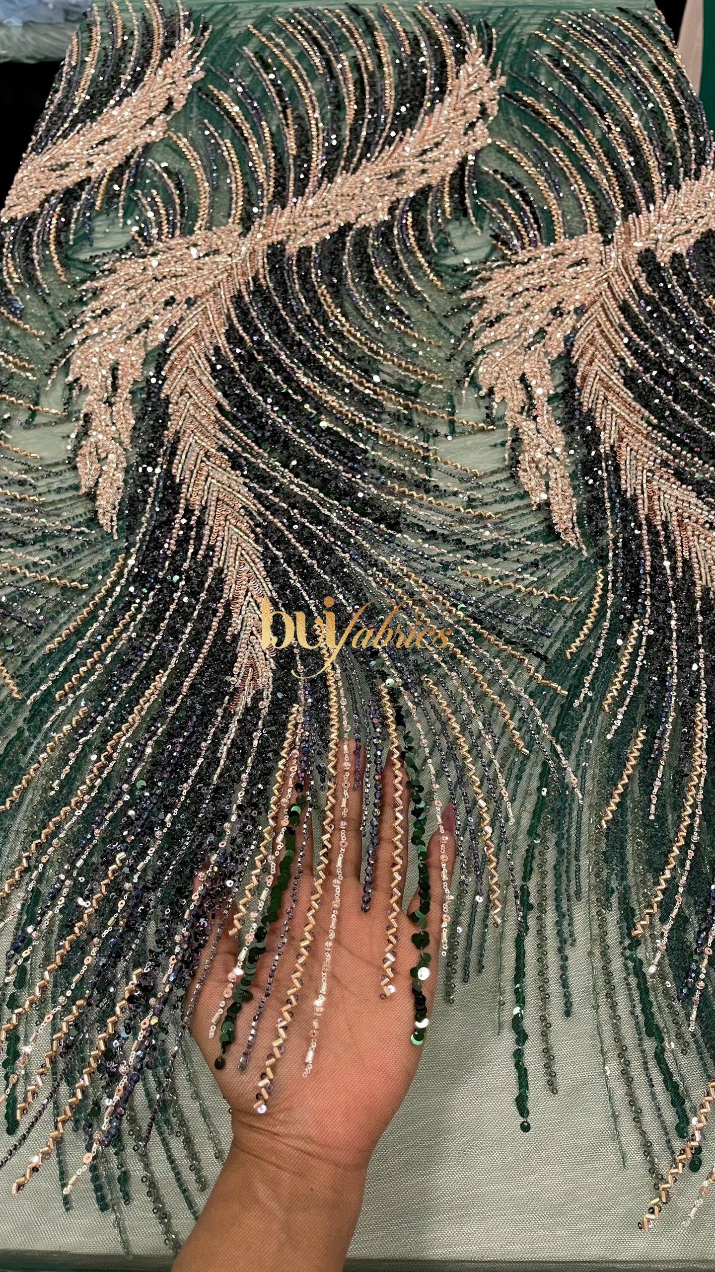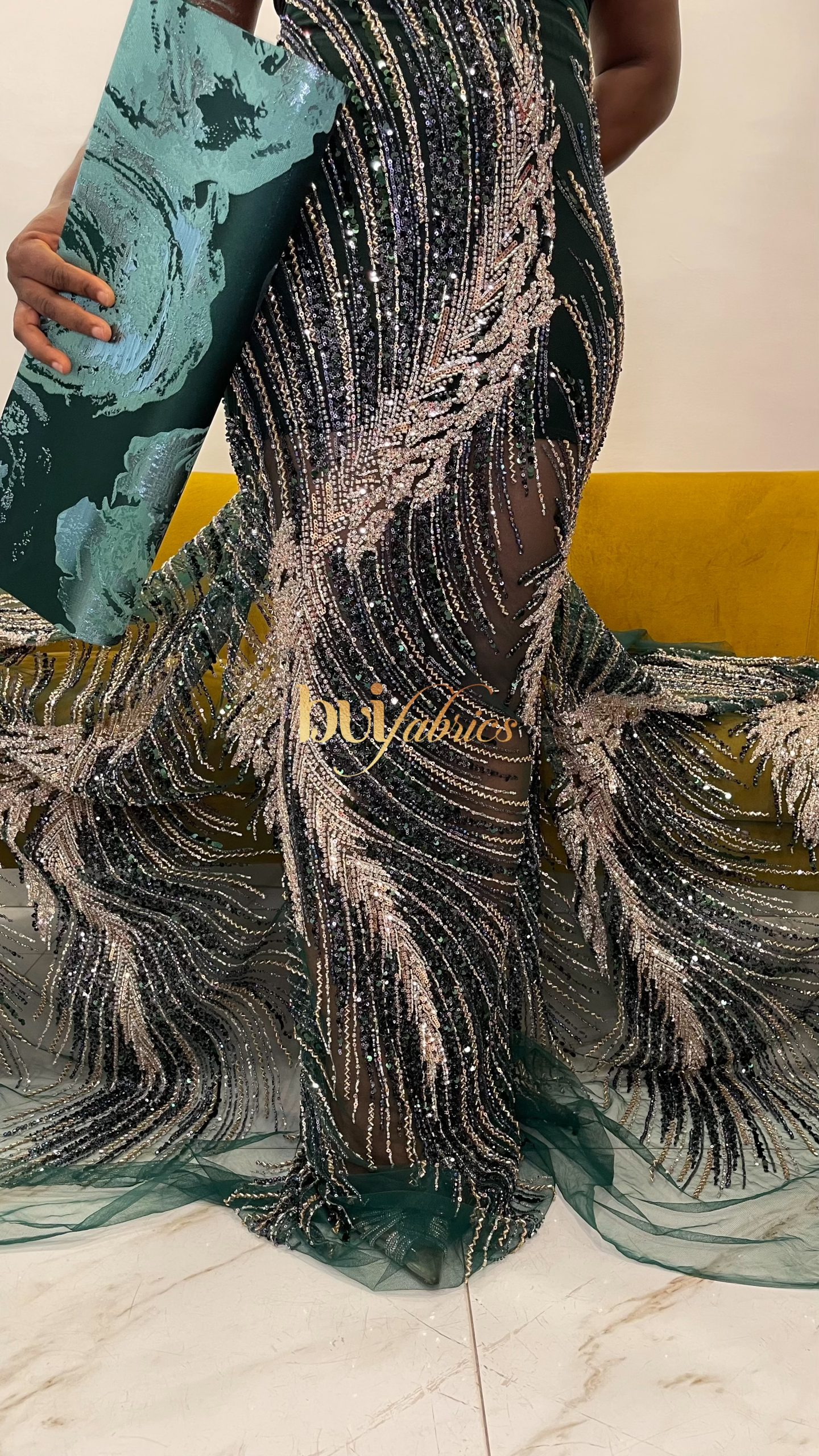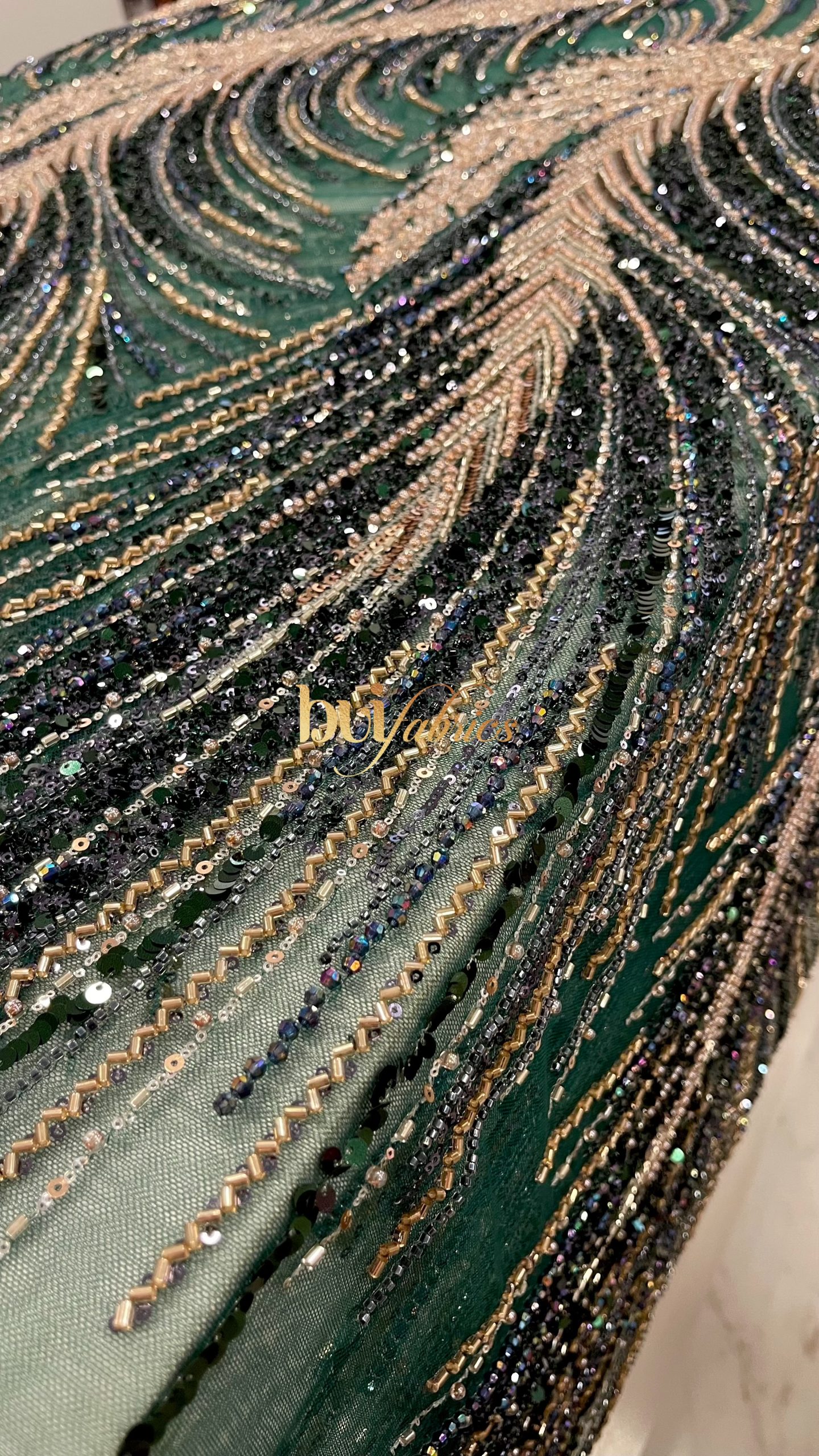 This 4-yard masterpiece features a rich deep green tulle base intricately adorned with hand-applied silver crystals and beaded detailing arranged in flowing, feather-inspired patterns. The elongated crystal lines create movement and dimension, giving the fabric a graceful cascading effect that elongates the silhouette beautifully.