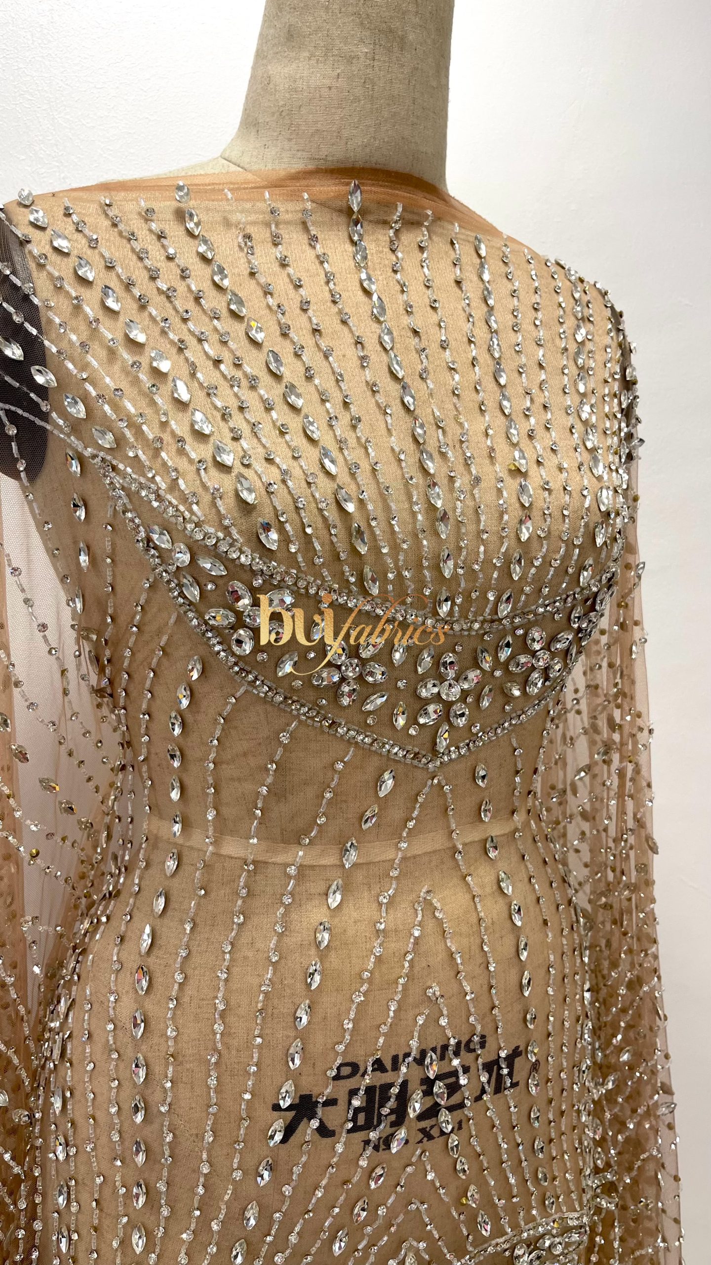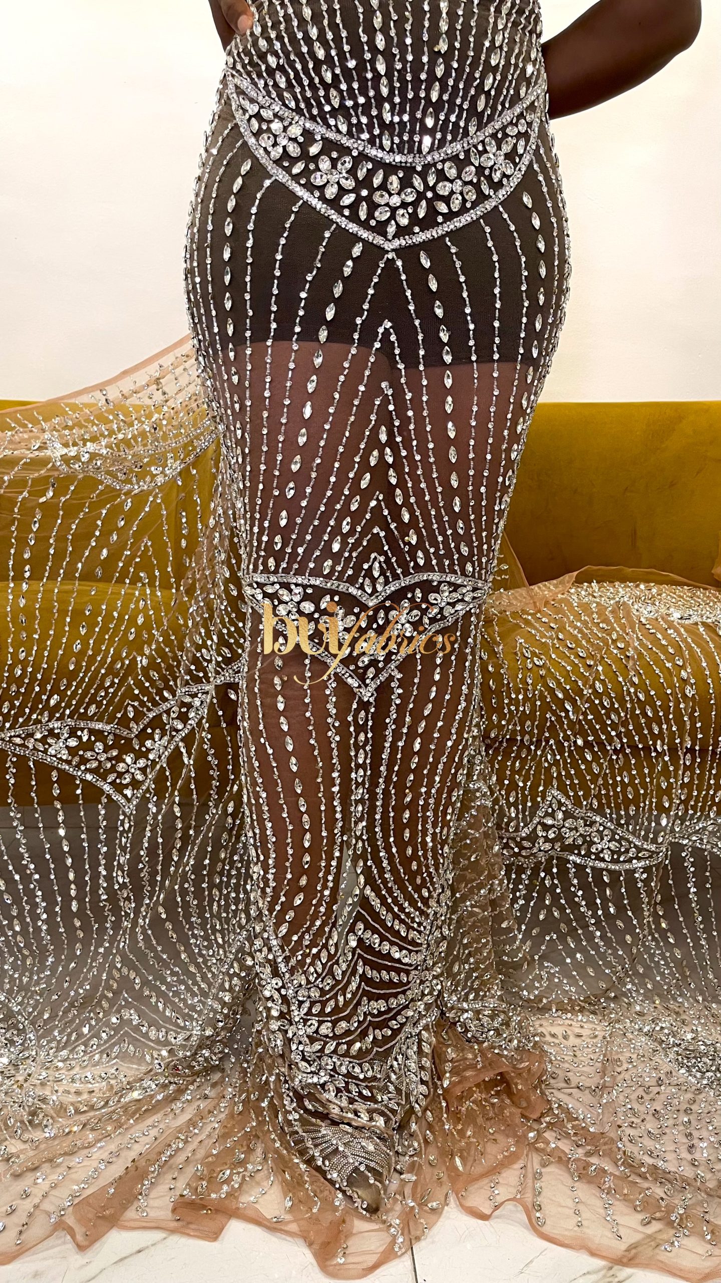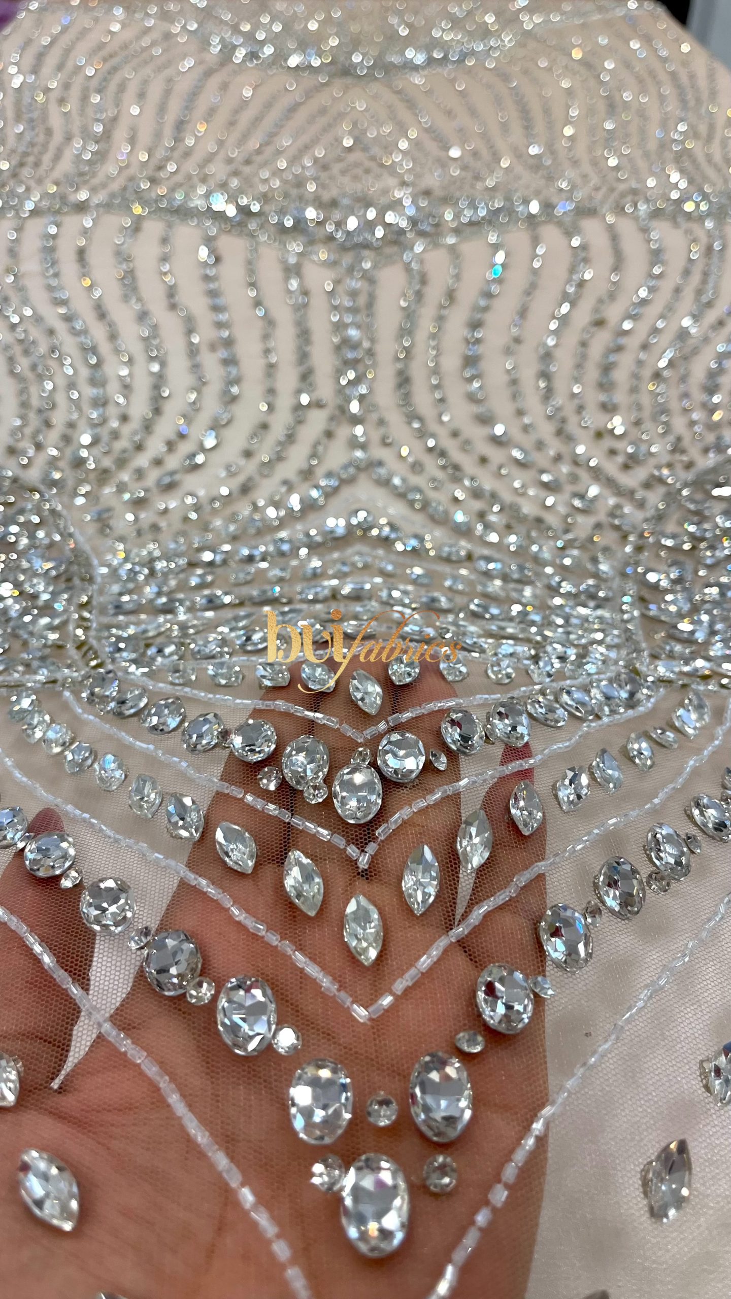 Introducing the Emma Handbeaded Crystal Beaded Tulle — a luminous couture fabric designed for the woman who embodies elegance, softness, and undeniable presence.