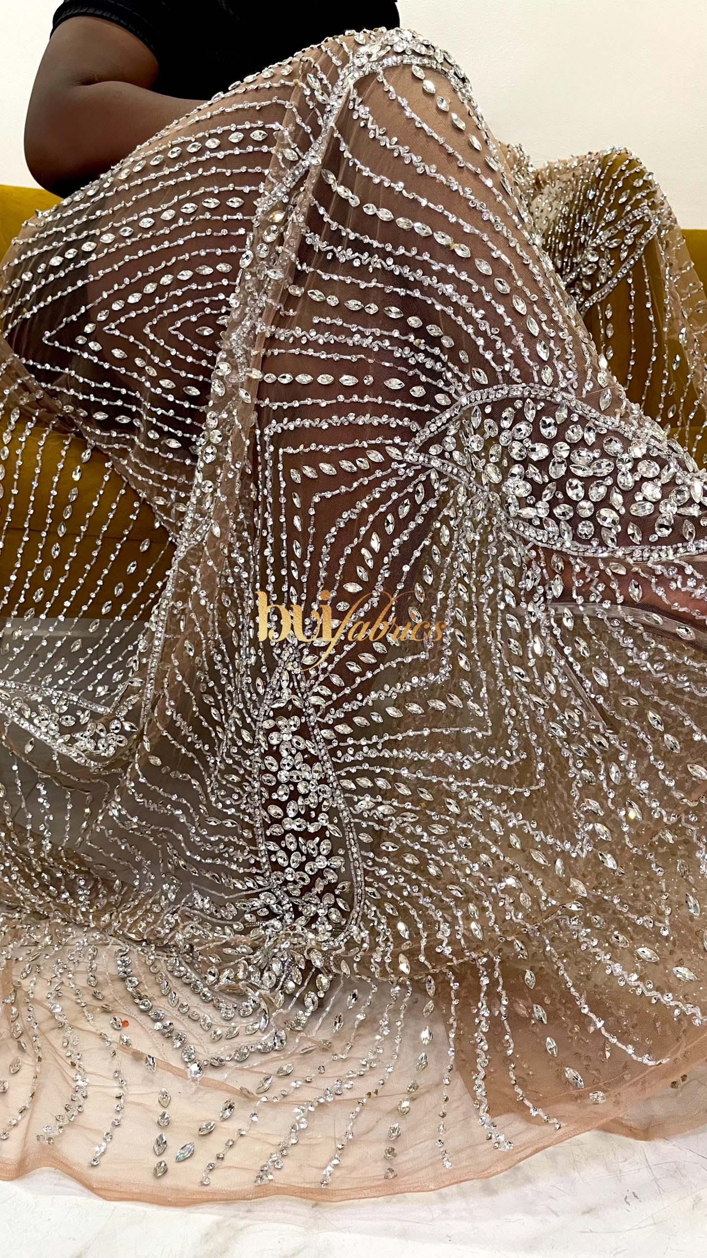 This exquisite 4-yard masterpiece is delicately layered with hand-applied silver crystals over a soft pink tulle base, creating a radiant shimmer that feels both romantic and powerful. The cool-toned crystal embellishments reflect light beautifully, giving the fabric a high-definition sparkle that glows effortlessly in photographs and under event lighting.