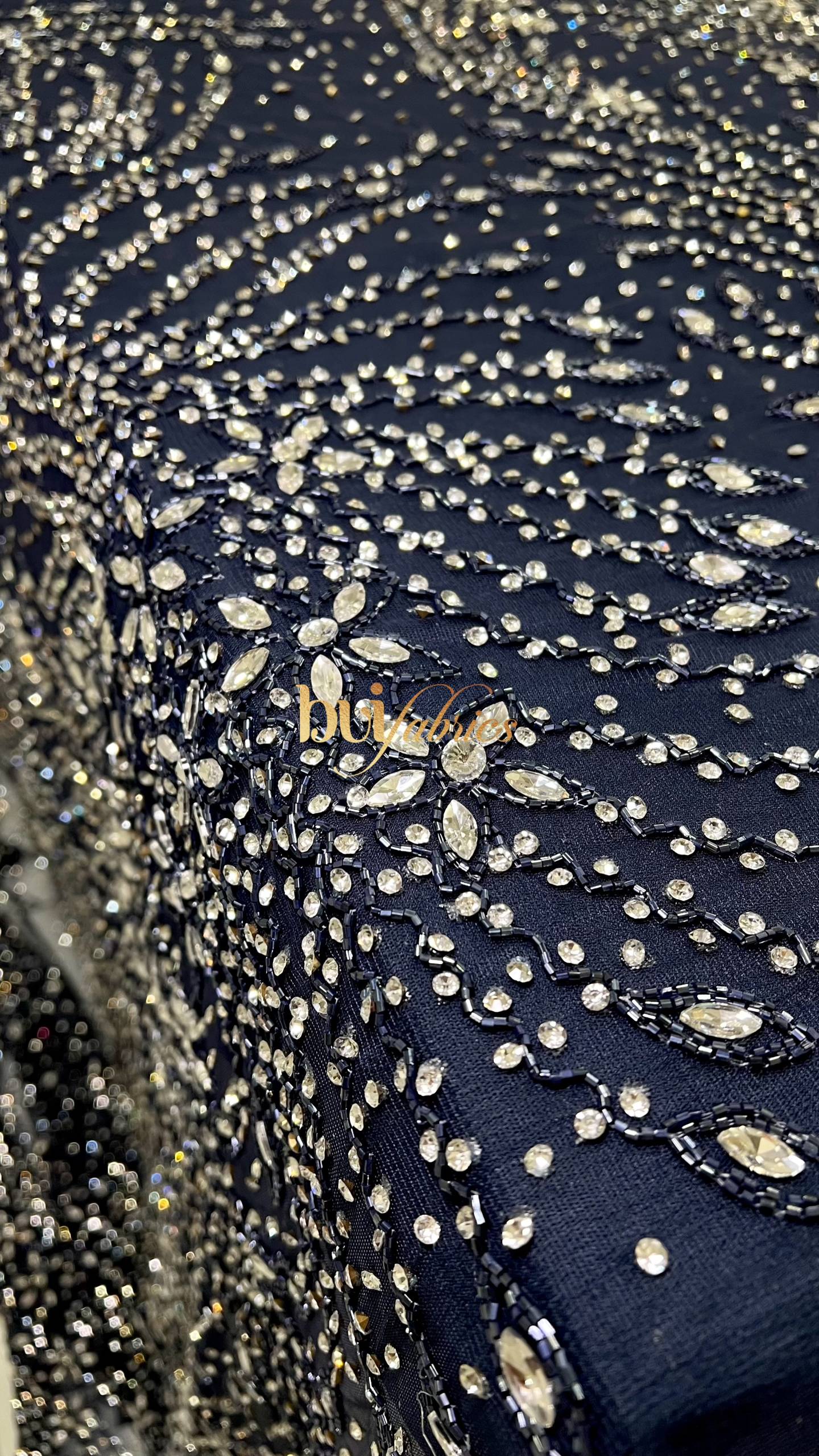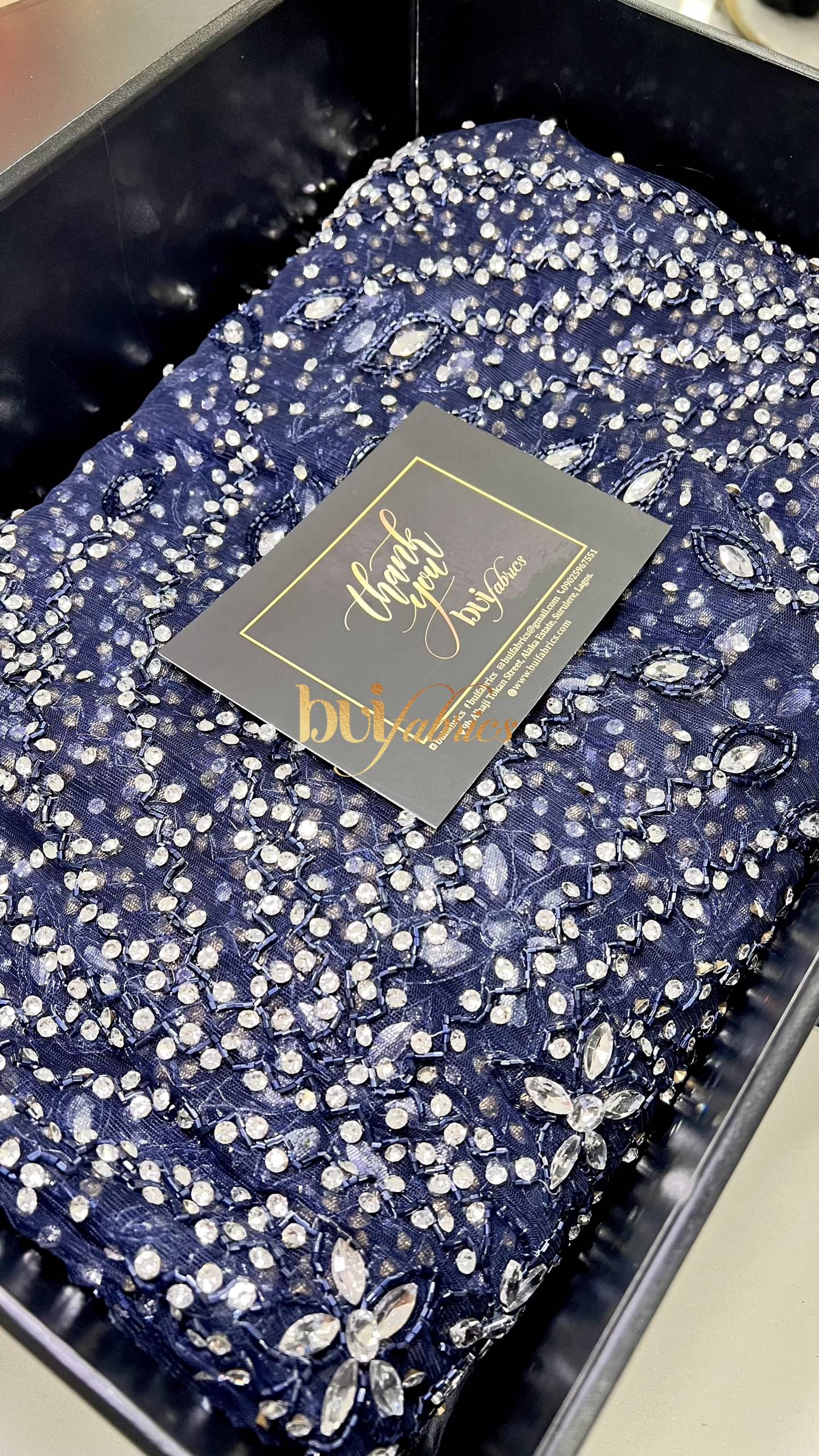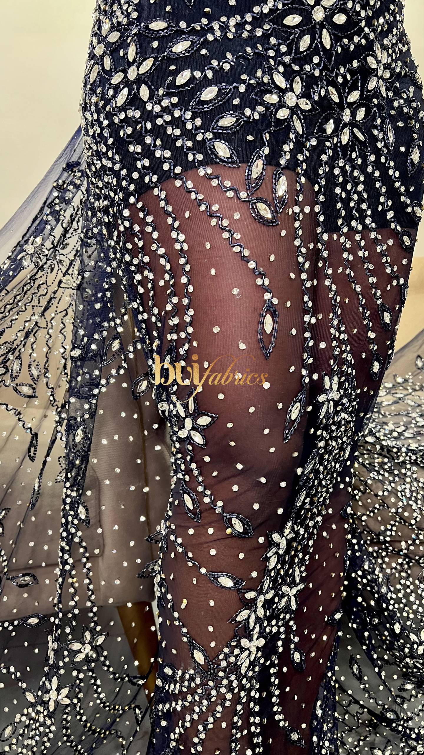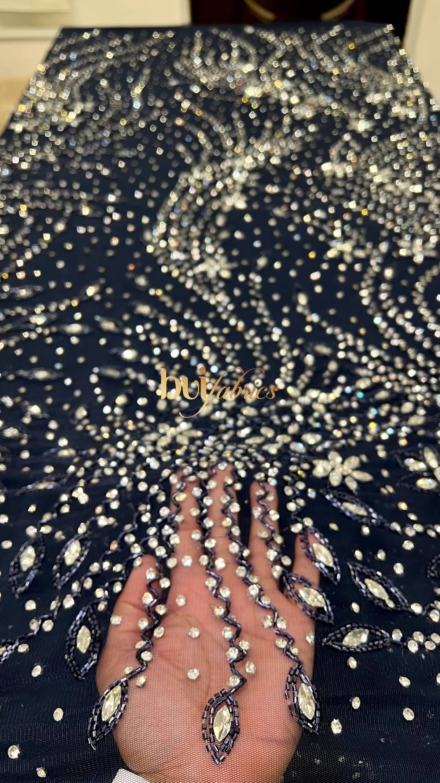Turn heads in luxury with the Ifeoma Beaded Crystal Tulle, a breathtaking navy masterpiece that combines timeless elegance with modern sophistication. Hand-embellished with glistening crystals and intricate beading, this fabric exudes pure opulence. Each yard features delicate floral and vine-like patterns that shimmer beautifully under light — perfect for couture dresses, bridal looks, or glamorous evening gowns.