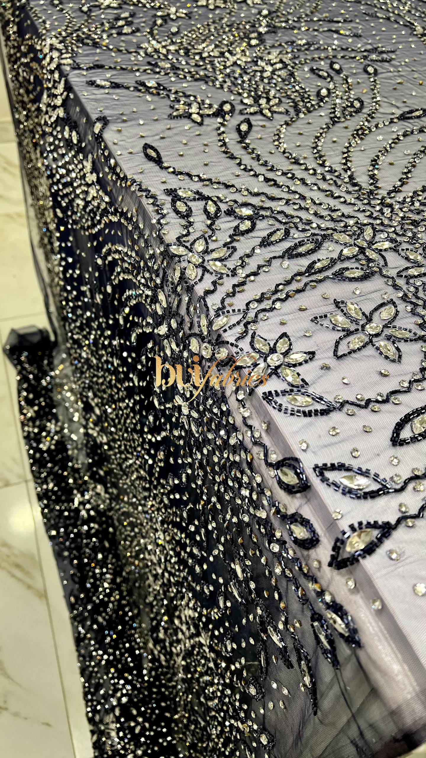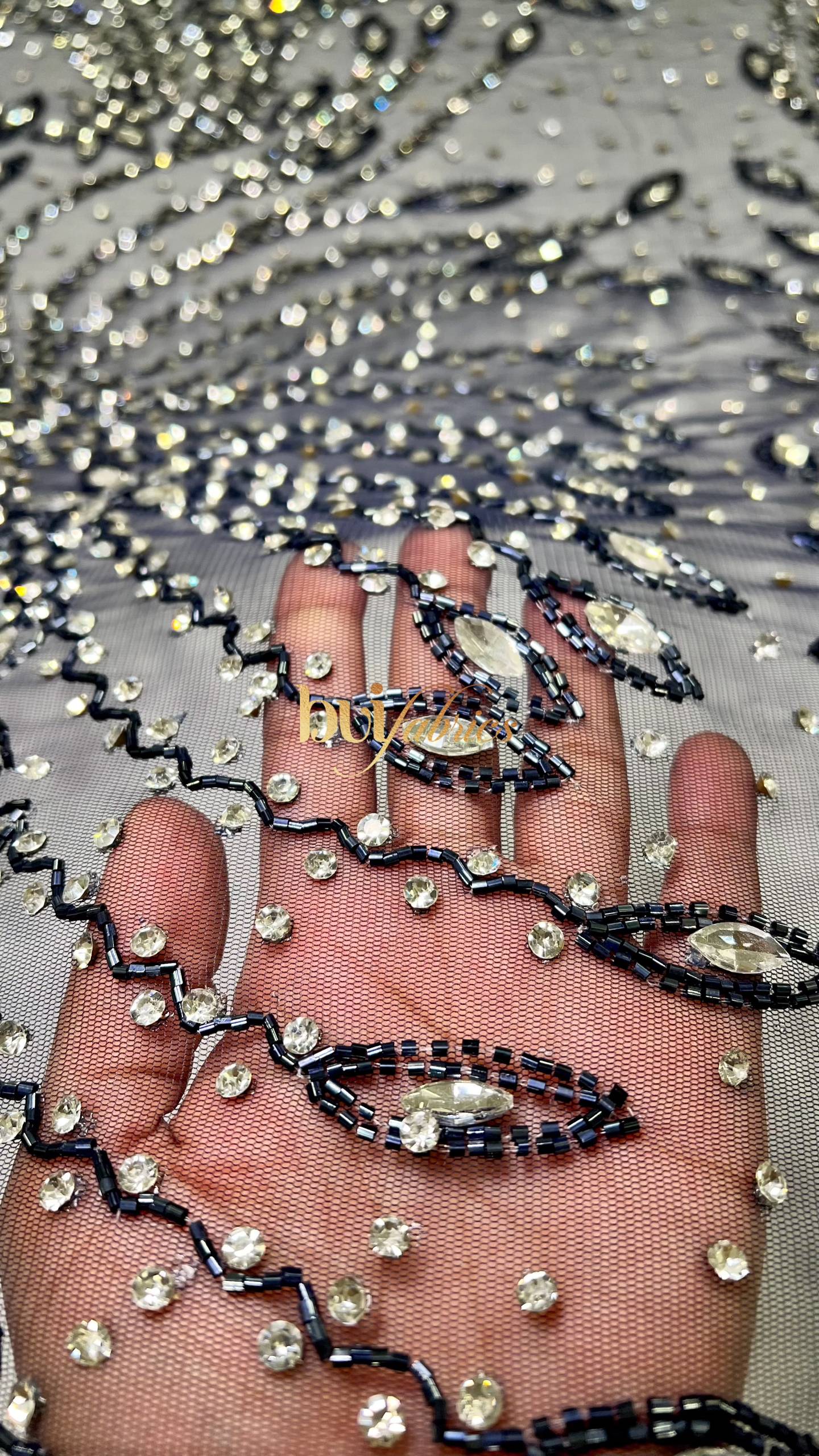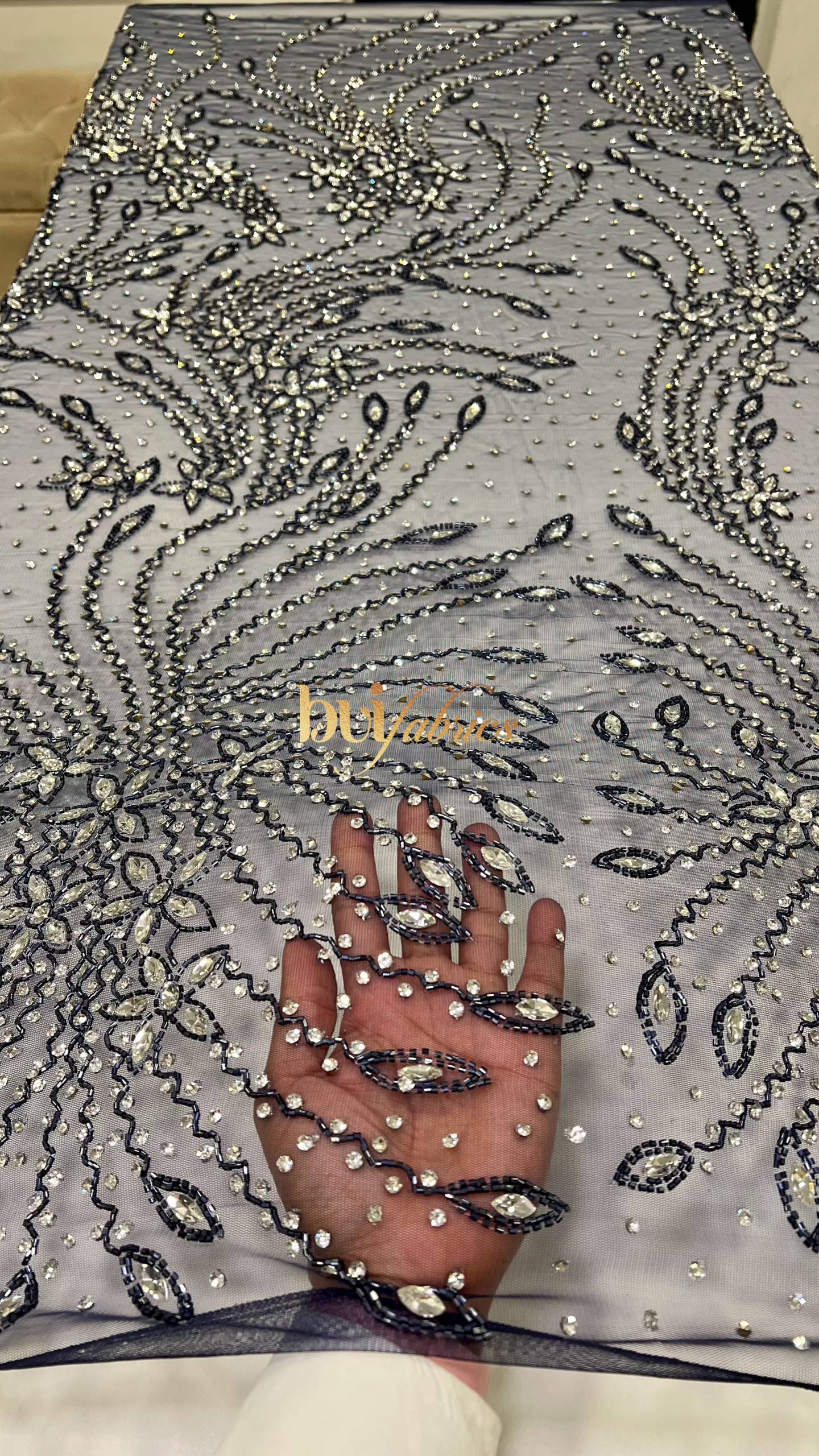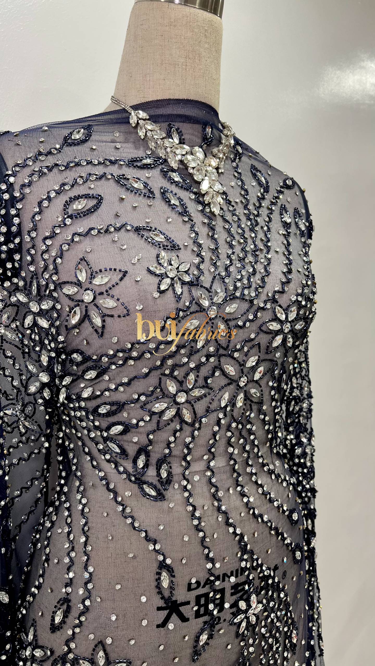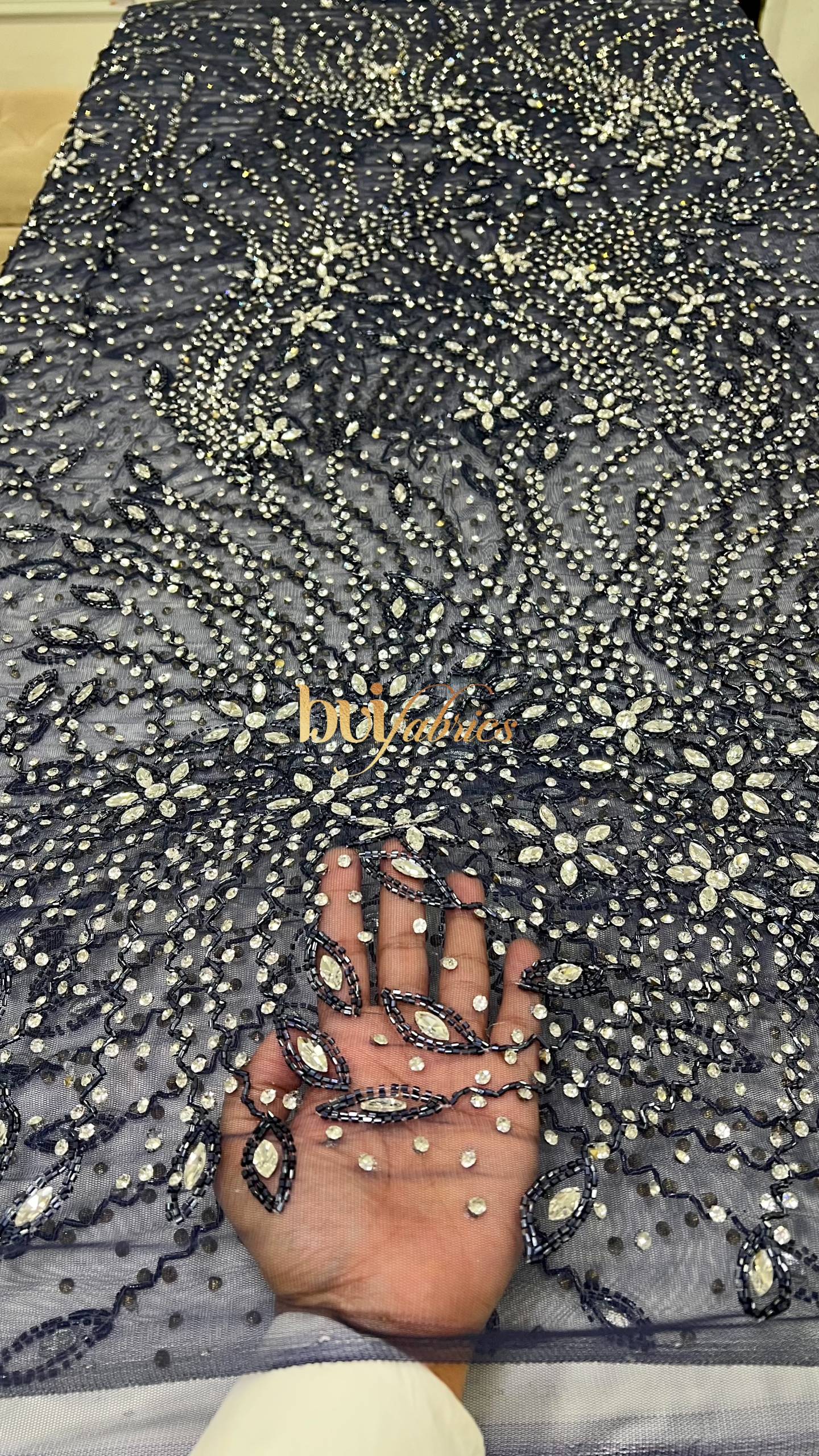 Turn heads in luxury with the Ifeoma Beaded Crystal Tulle, a breathtaking navy masterpiece that combines timeless elegance with modern sophistication. Hand-embellished with glistening crystals and intricate beading, this fabric exudes pure opulence. Each yard features delicate floral and vine-like patterns that shimmer beautifully under light — perfect for couture dresses, bridal looks, or glamorous evening gowns.