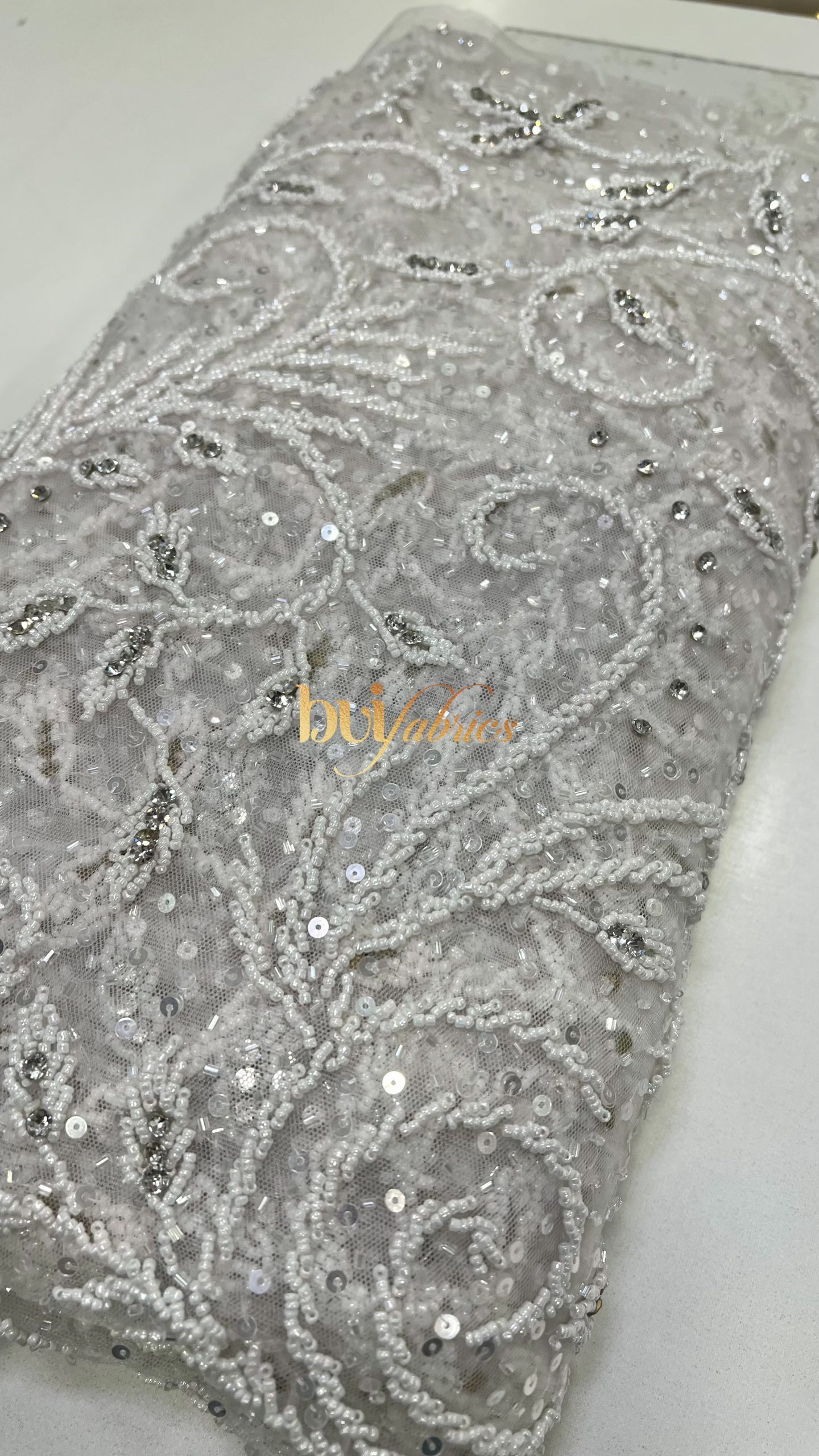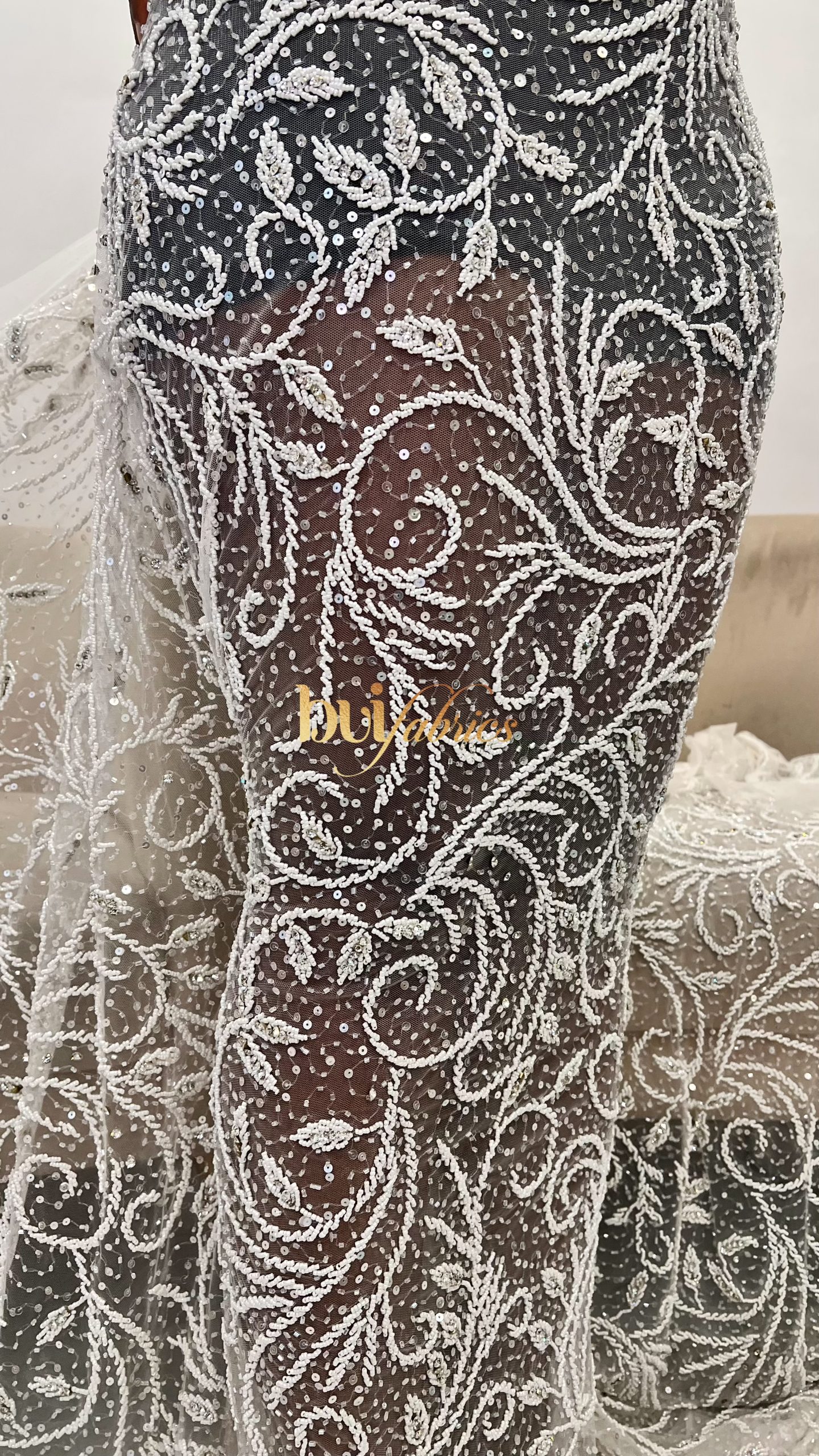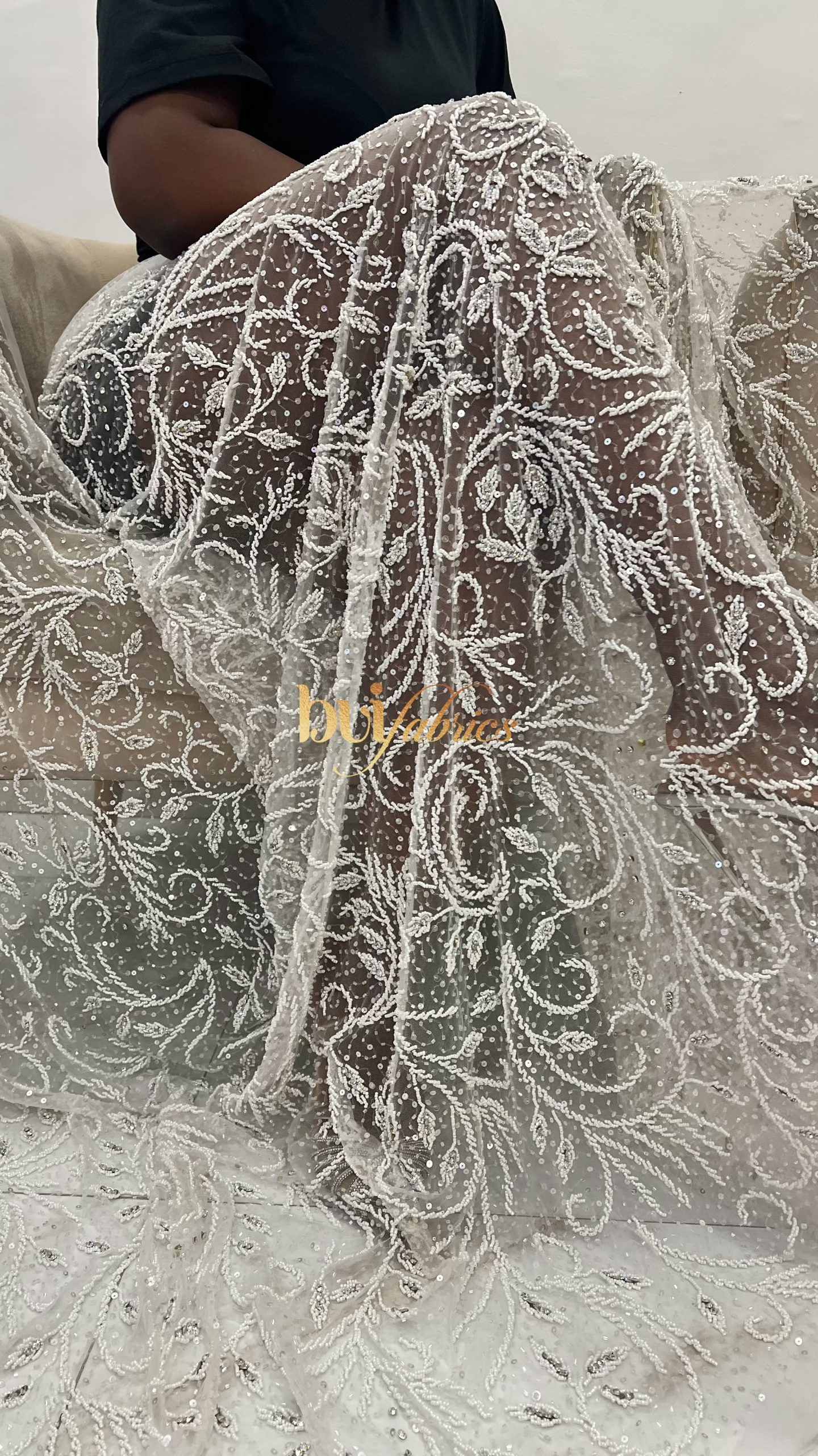 The Iyene Pearl Beaded Tulle is a stunning expression of bridal elegance and timeless luxury. Crafted on a soft tulle base, this exquisite fabric features hand-embroidered pearl beadwork and shimmering sequins intricately arranged into graceful, flowing patterns that catch the light beautifully.