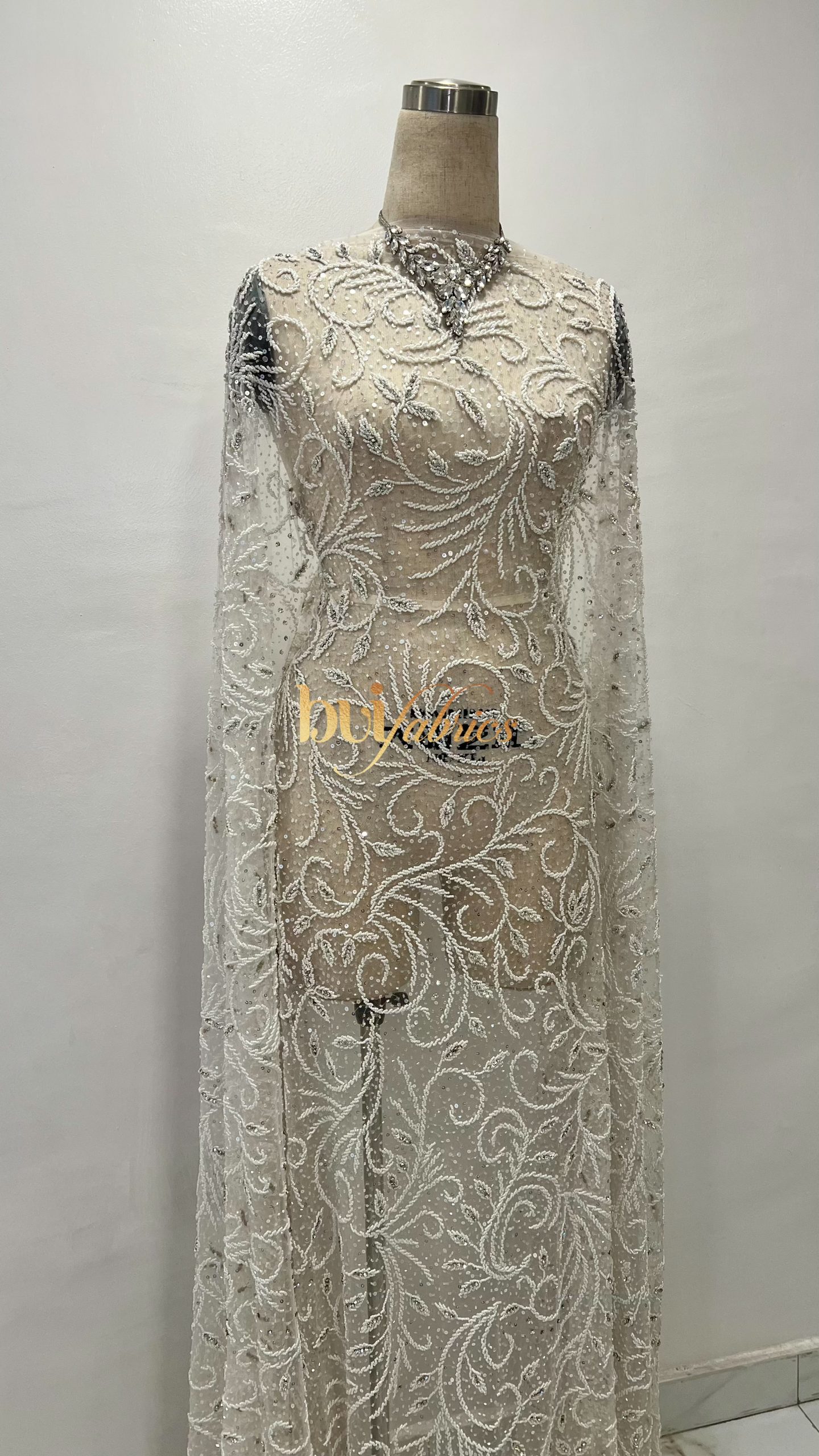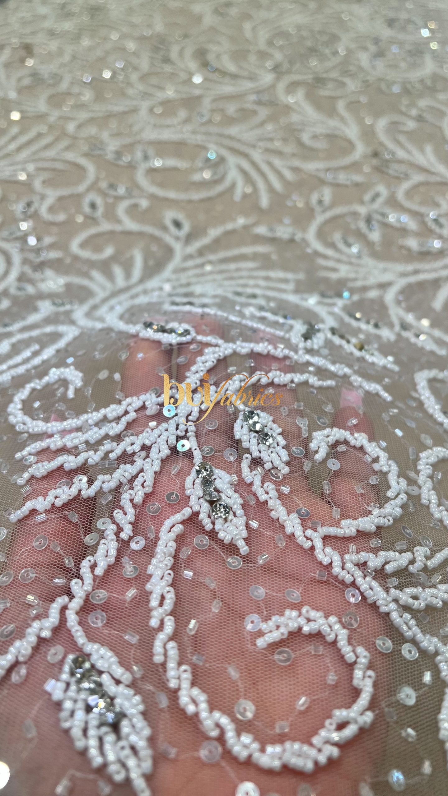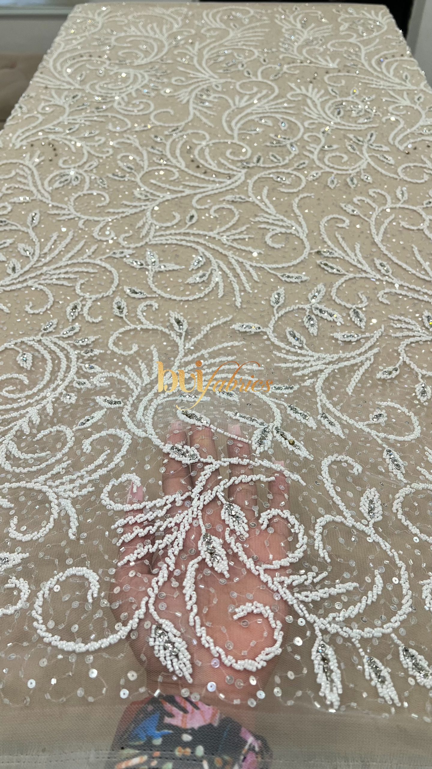 The Iyene Pearl Beaded Tulle is a stunning expression of bridal elegance and timeless luxury. Crafted on a soft tulle base, this exquisite fabric features hand-embroidered pearl beadwork and shimmering sequins intricately arranged into graceful, flowing patterns that catch the light beautifully.
