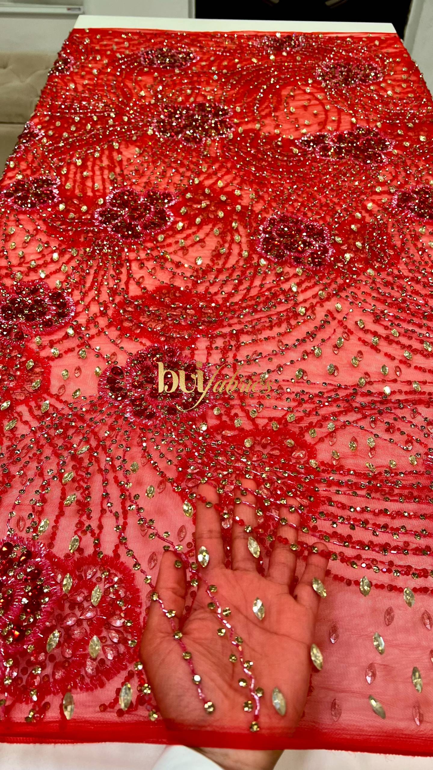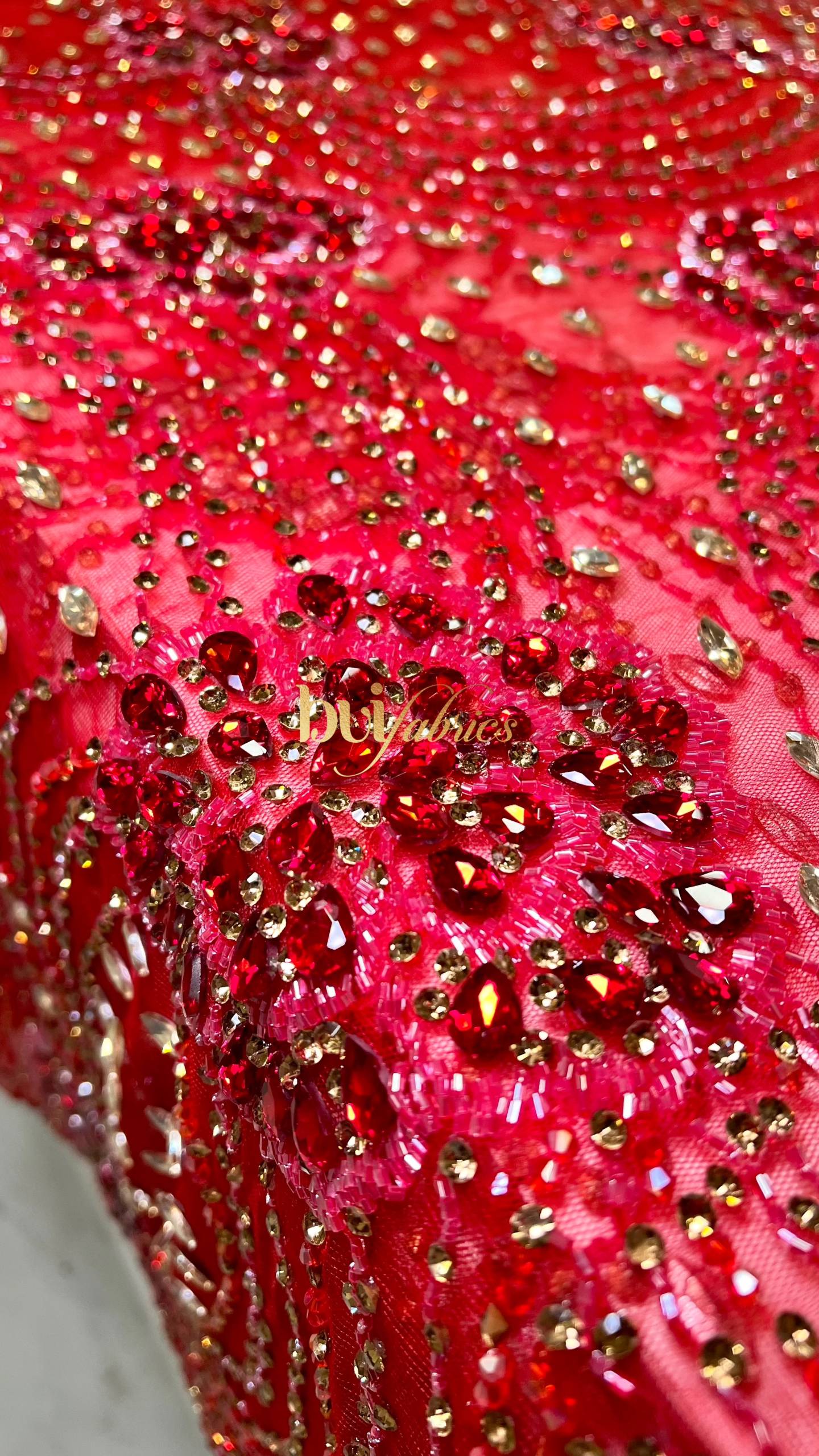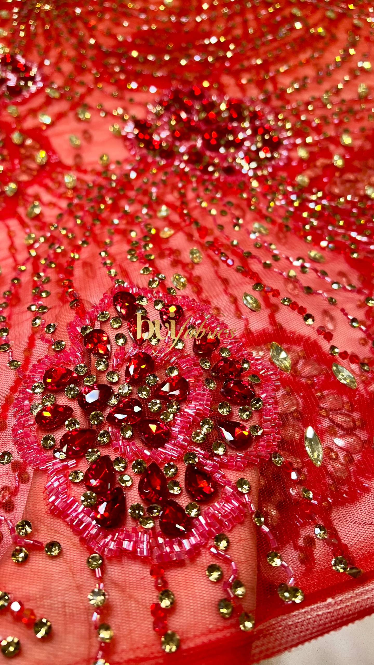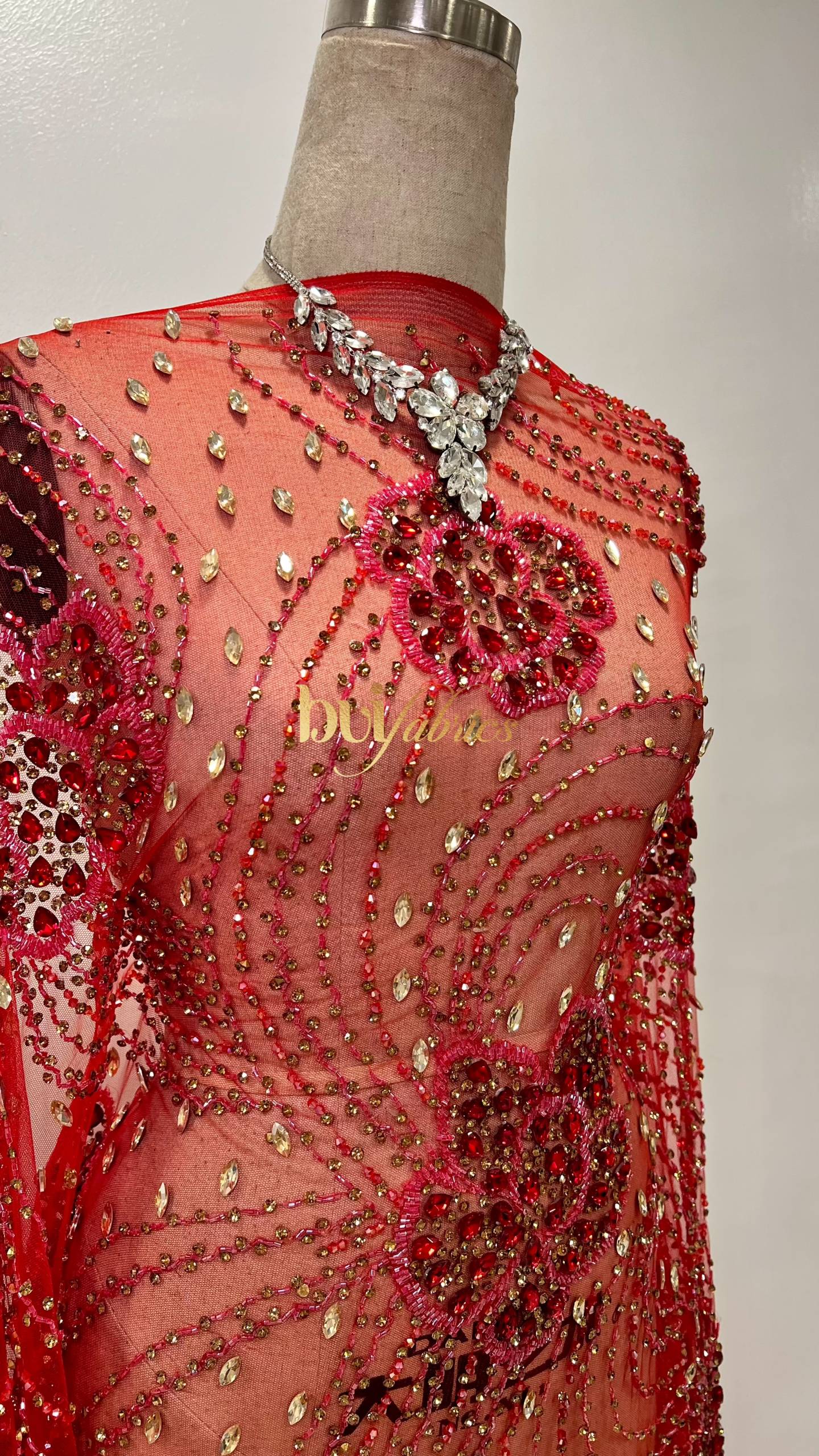 Turn heads in the show-stopping Scarlet Beaded Crystal Tulle — a masterpiece of craftsmanship and bold elegance. This statement fabric features a rich scarlet red base lavishly adorned with intricate beading, sparkling crystals, and striking floral patterns that shimmer with every movement.