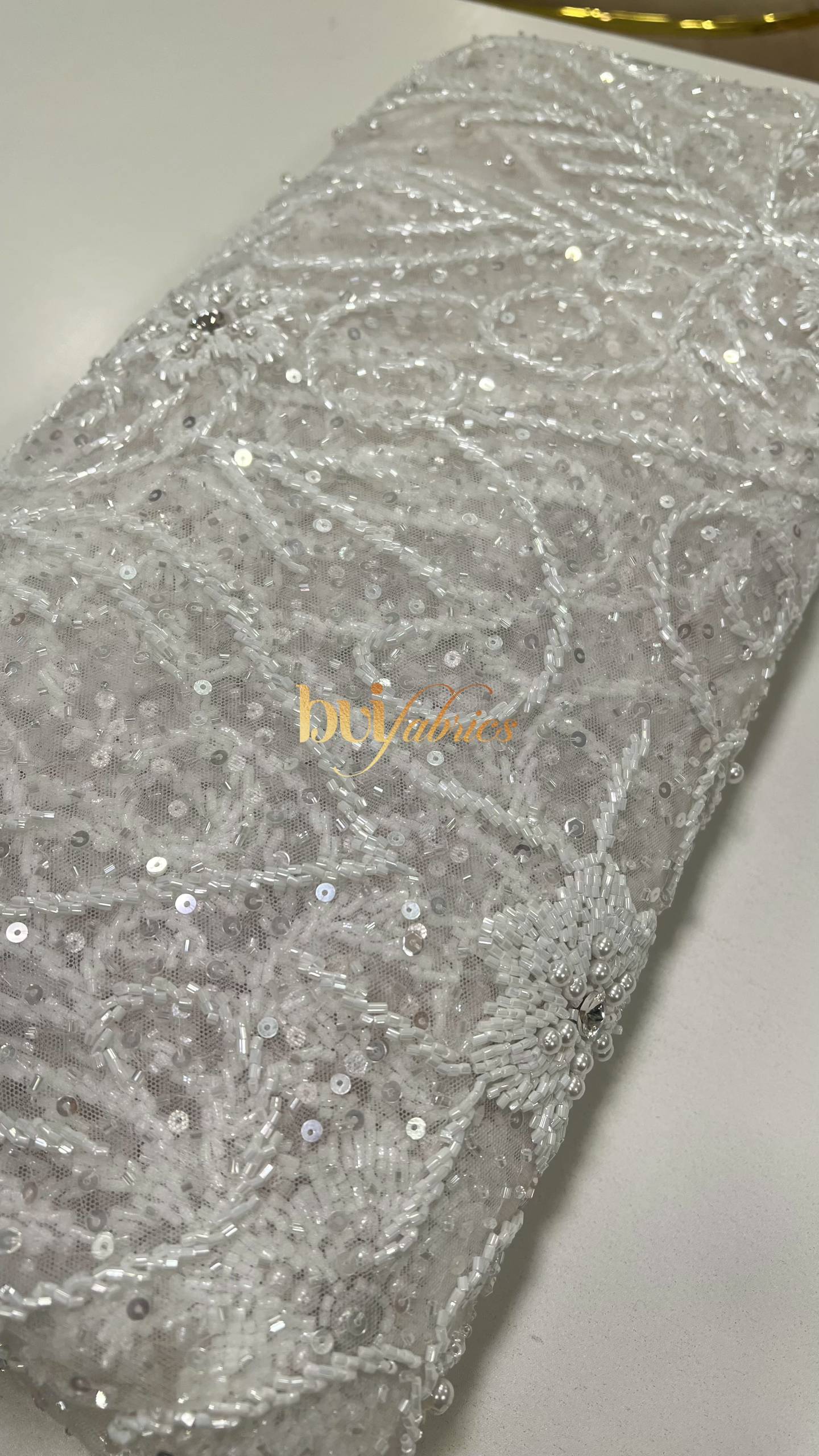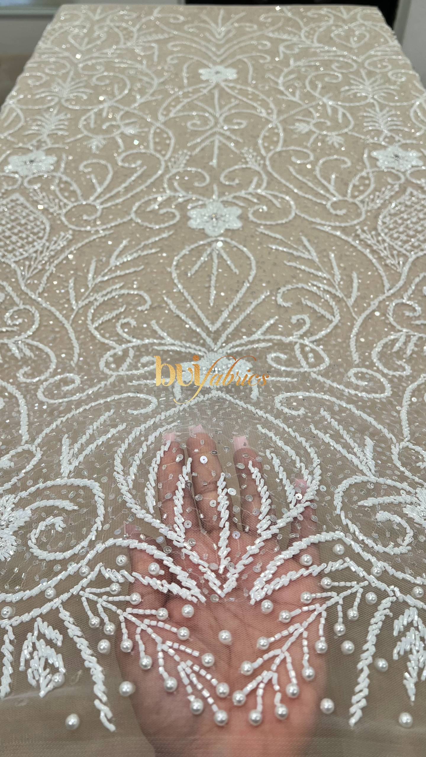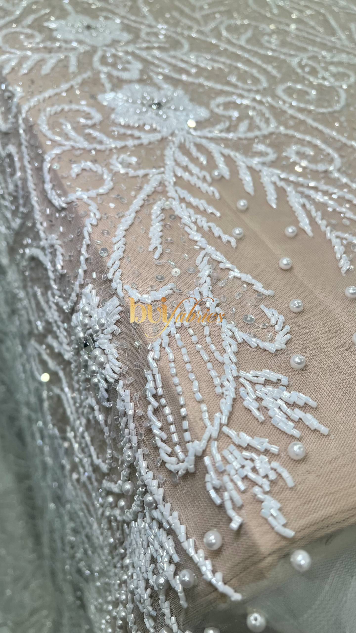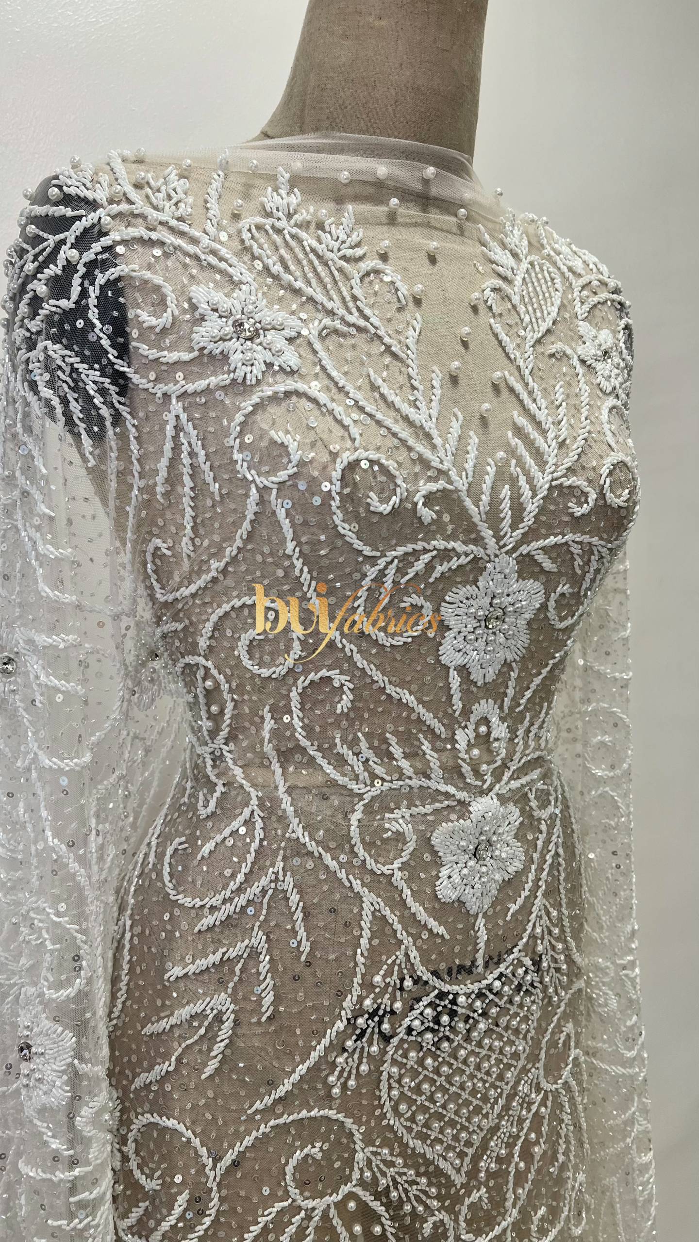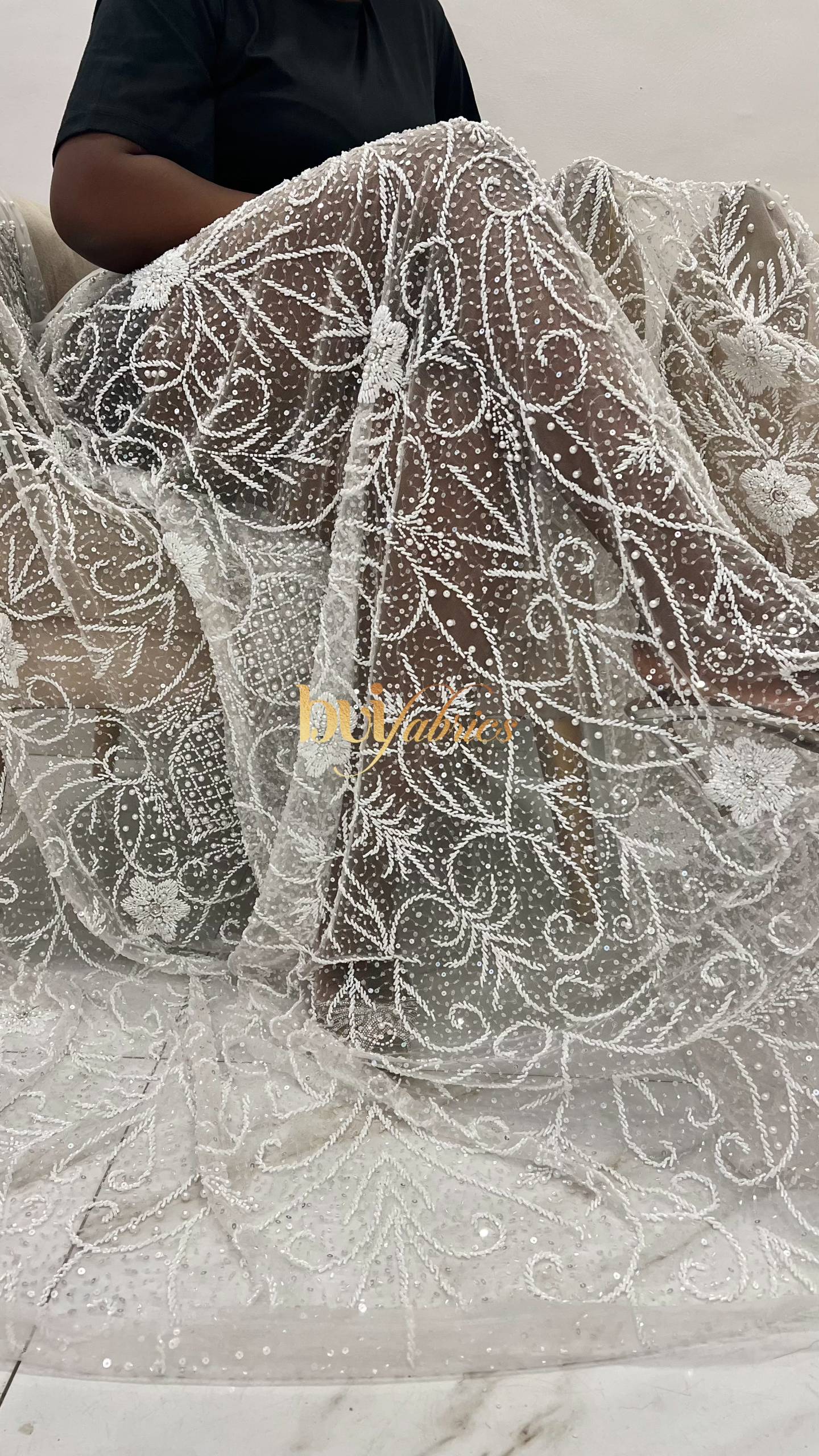 Simi is the perfect combination of embroidery and gorgeous beading. We love the intricate details. We are in love with the gorgeous luxury details on this amazing fabric. Can you see the delicate pearl details, love it. This fabric is just AMAZING. If you want to make a statement then Simi is for you. Fabric comes in 4 yards and price quoted is per piece. Fabric comes in 4kg. Fabric comes in silver, white and gold.