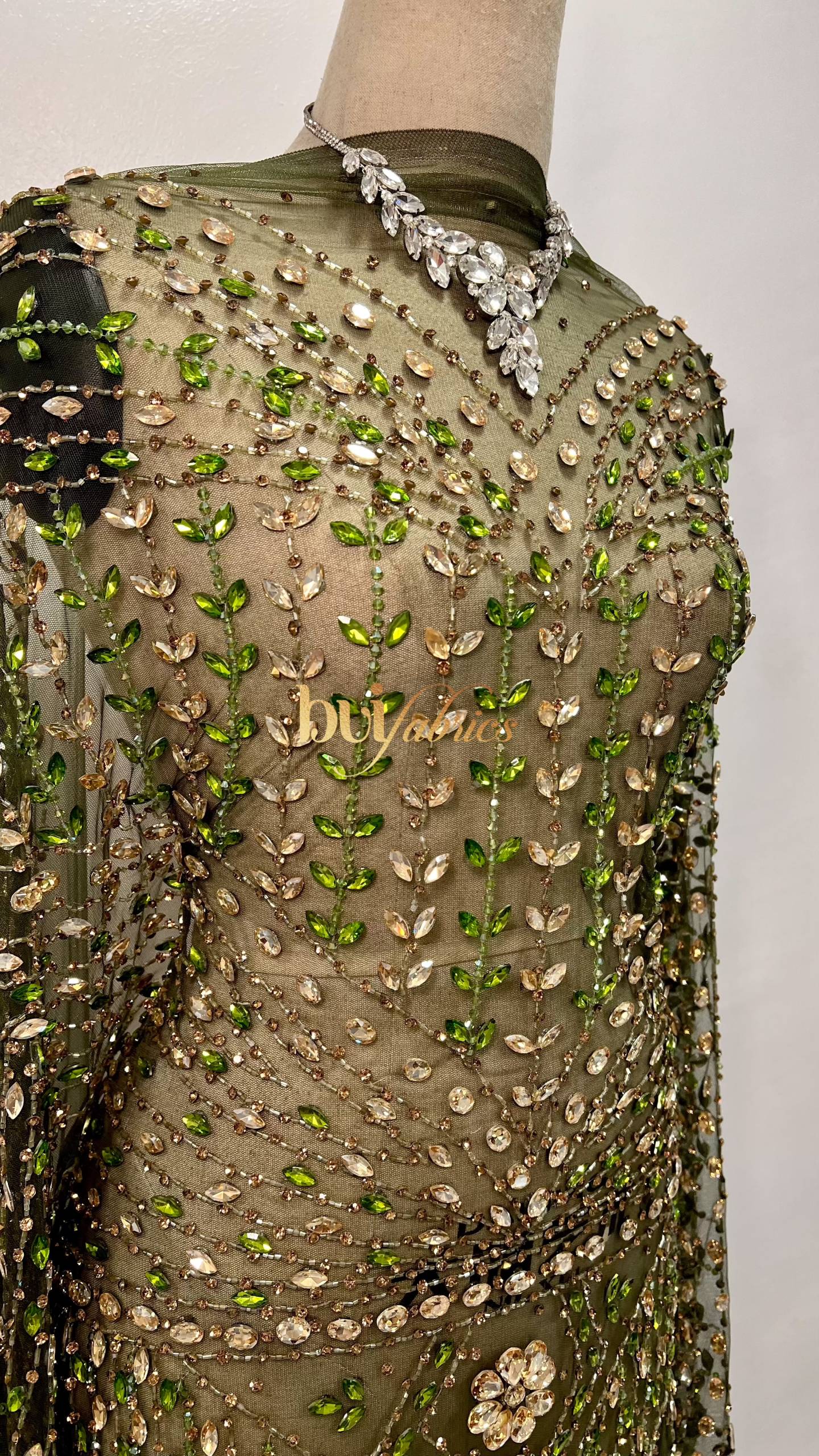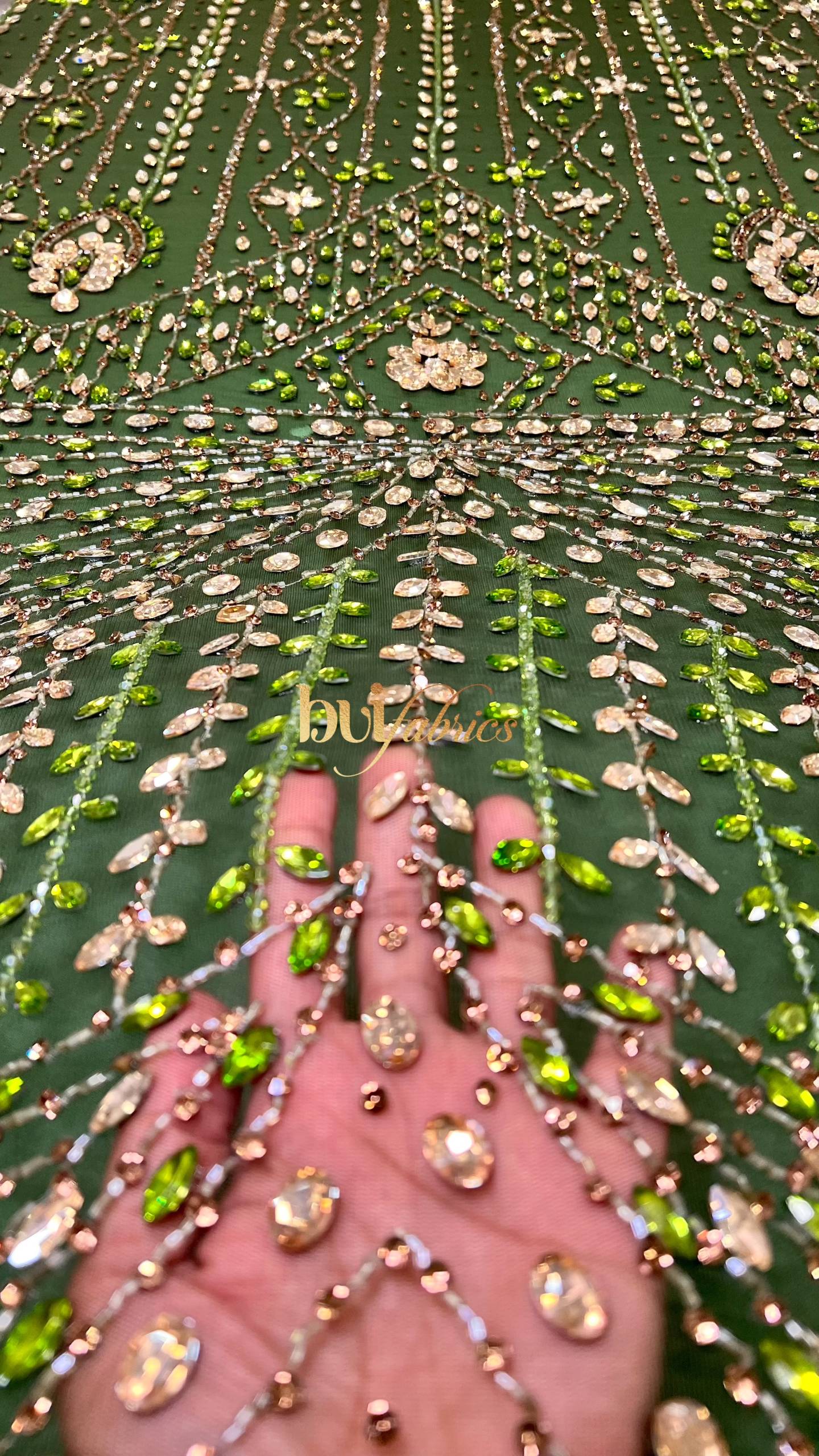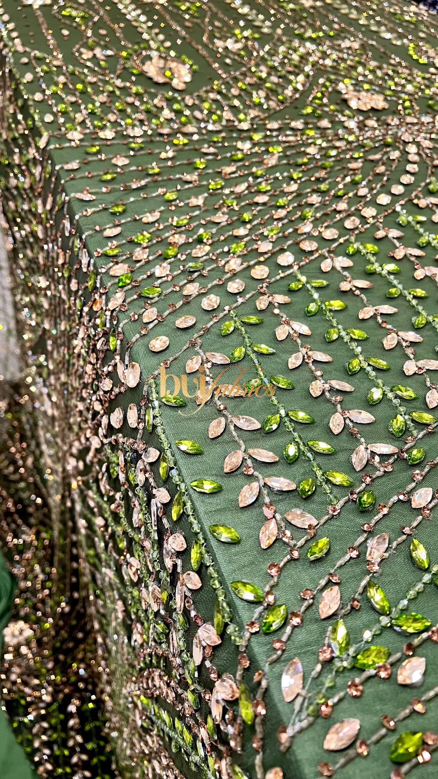 Meet the Somto Beaded Crystal Tulle — a breathtaking masterpiece that celebrates opulence in motion. Hand-embellished with lush green and champagne crystals on a deep olive tulle base, this fabric captures light from every angle and exudes effortless sophistication.