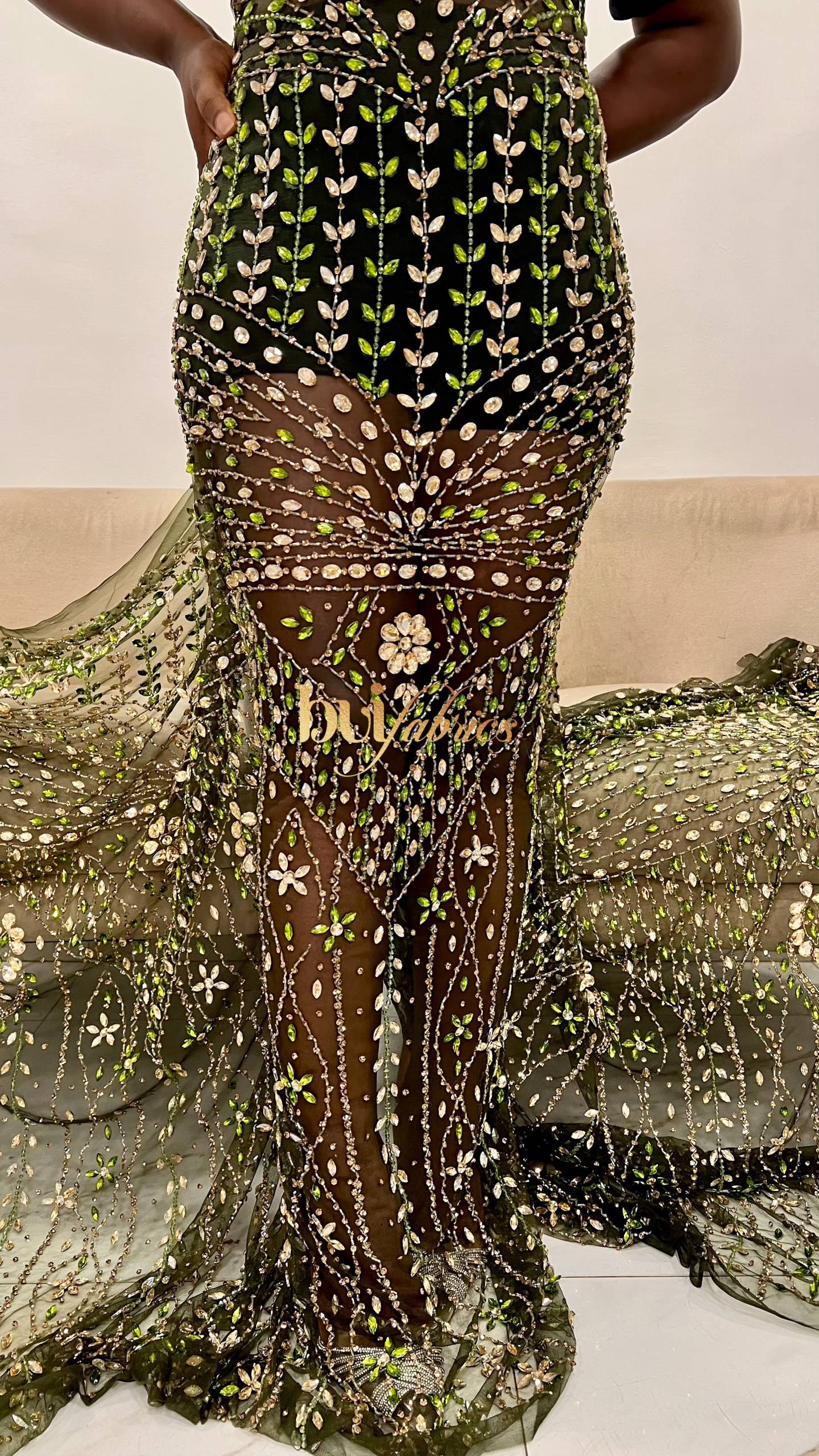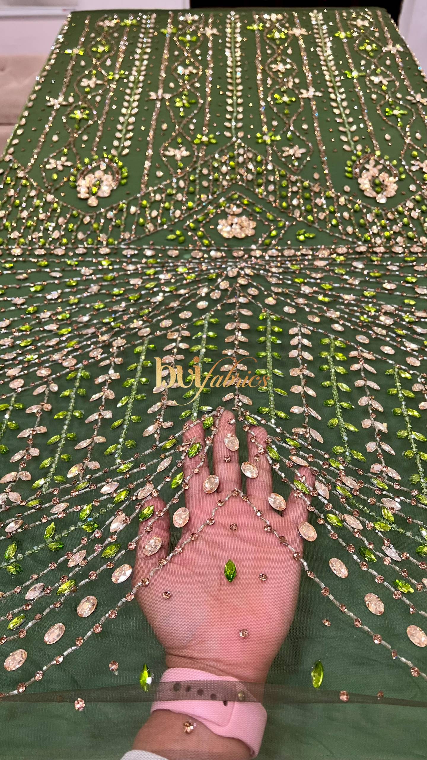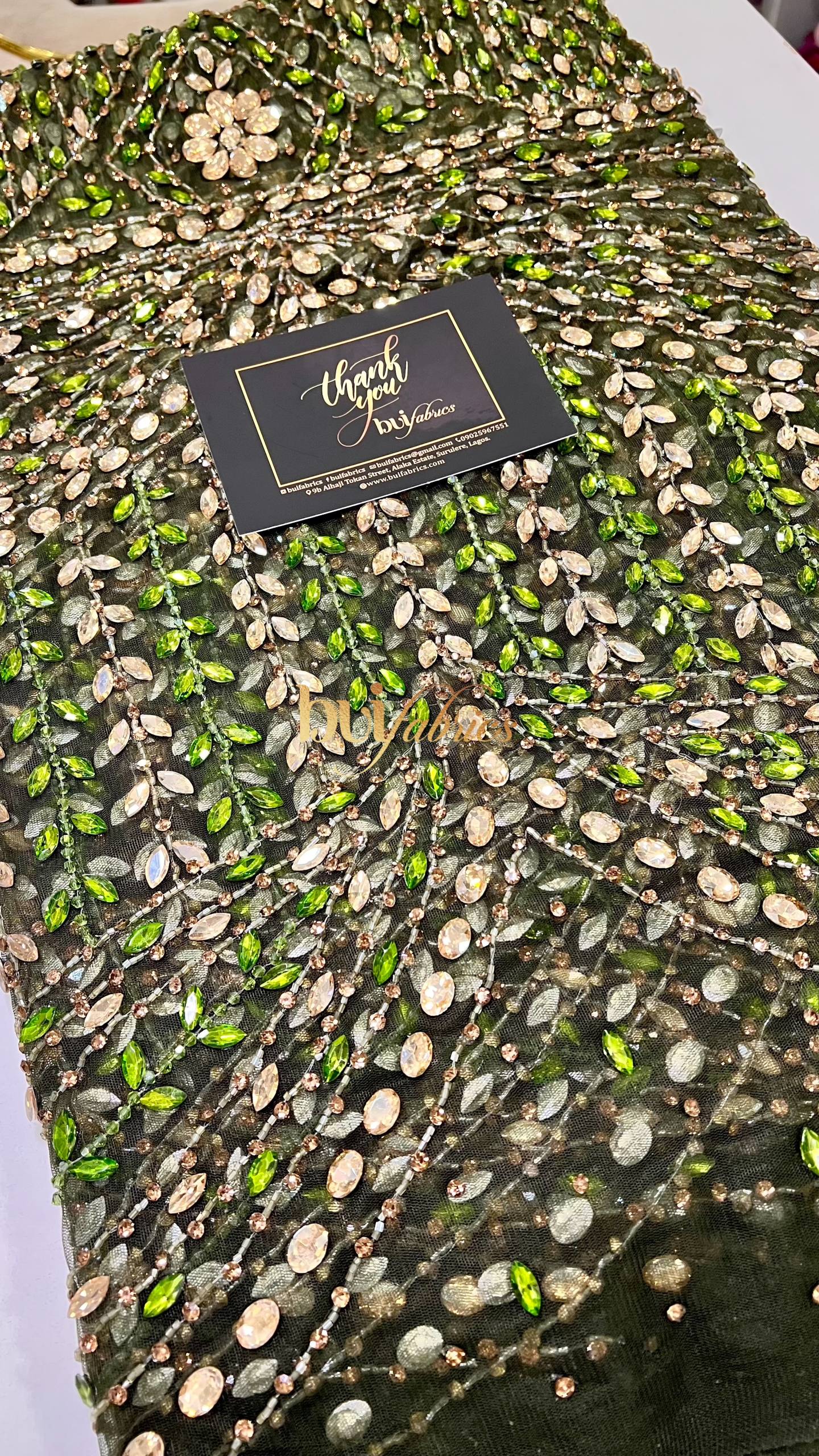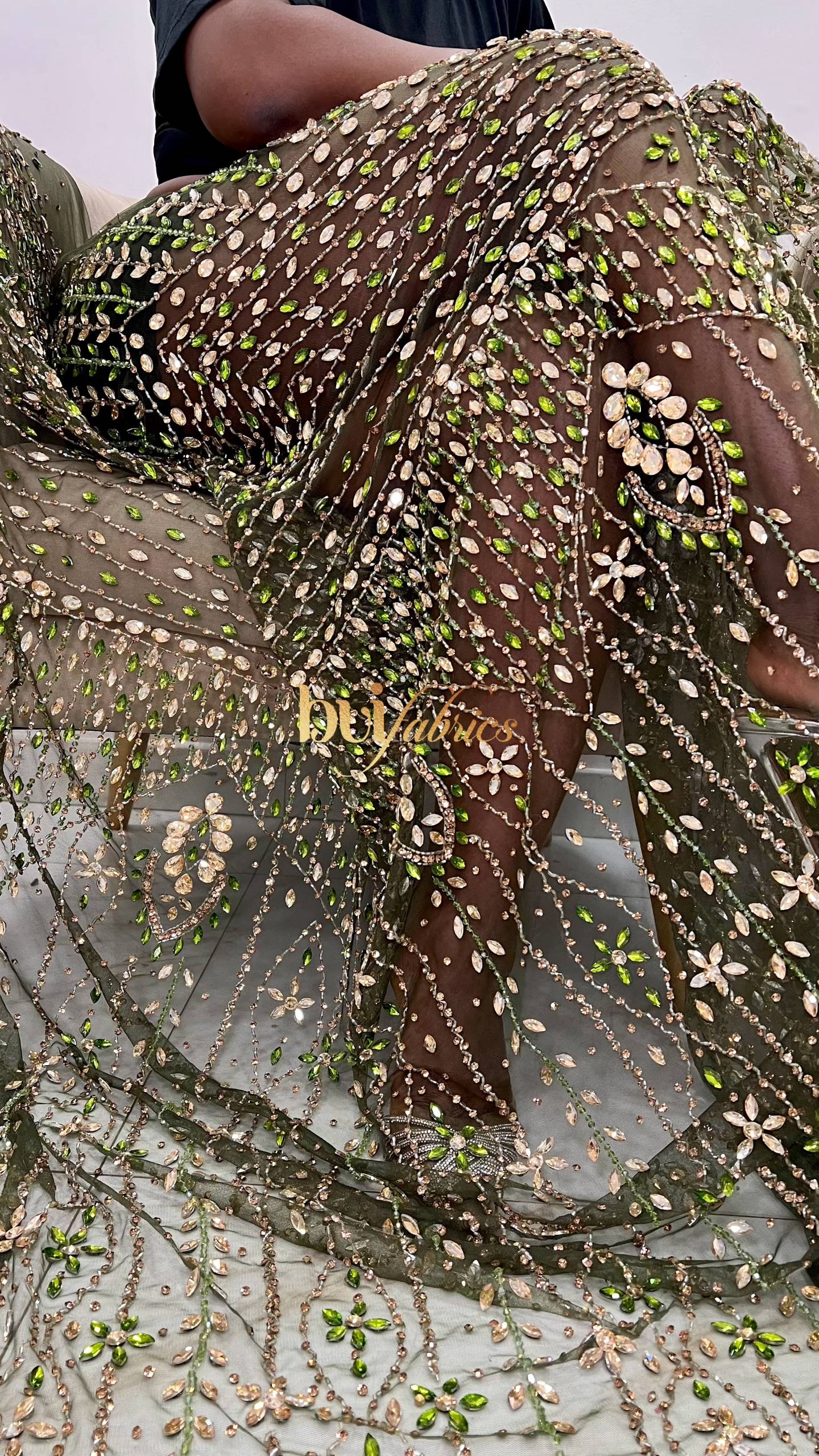 Meet the Somto Beaded Crystal Tulle — a breathtaking masterpiece that celebrates opulence in motion. Hand-embellished with lush green and champagne crystals on a deep olive tulle base, this fabric captures light from every angle and exudes effortless sophistication.